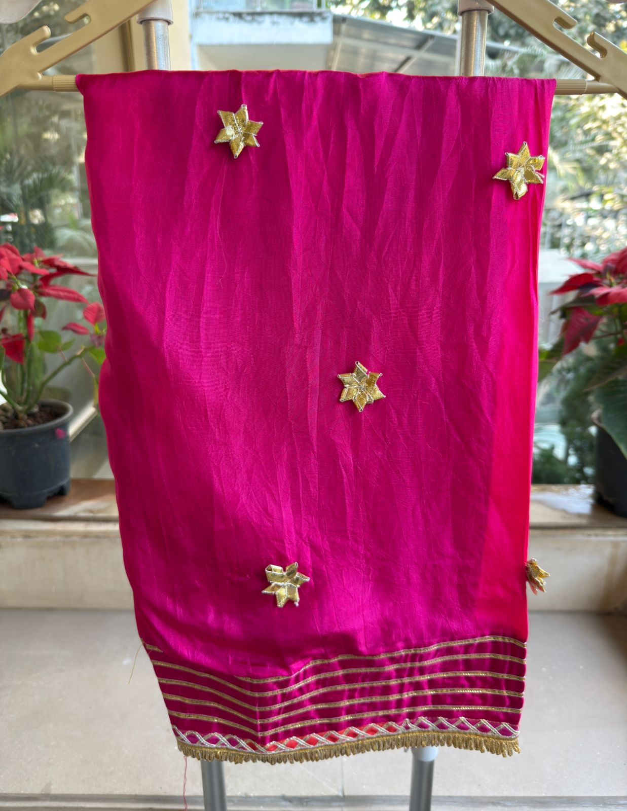 Decorative zig-zag gota lace enhances the borders.