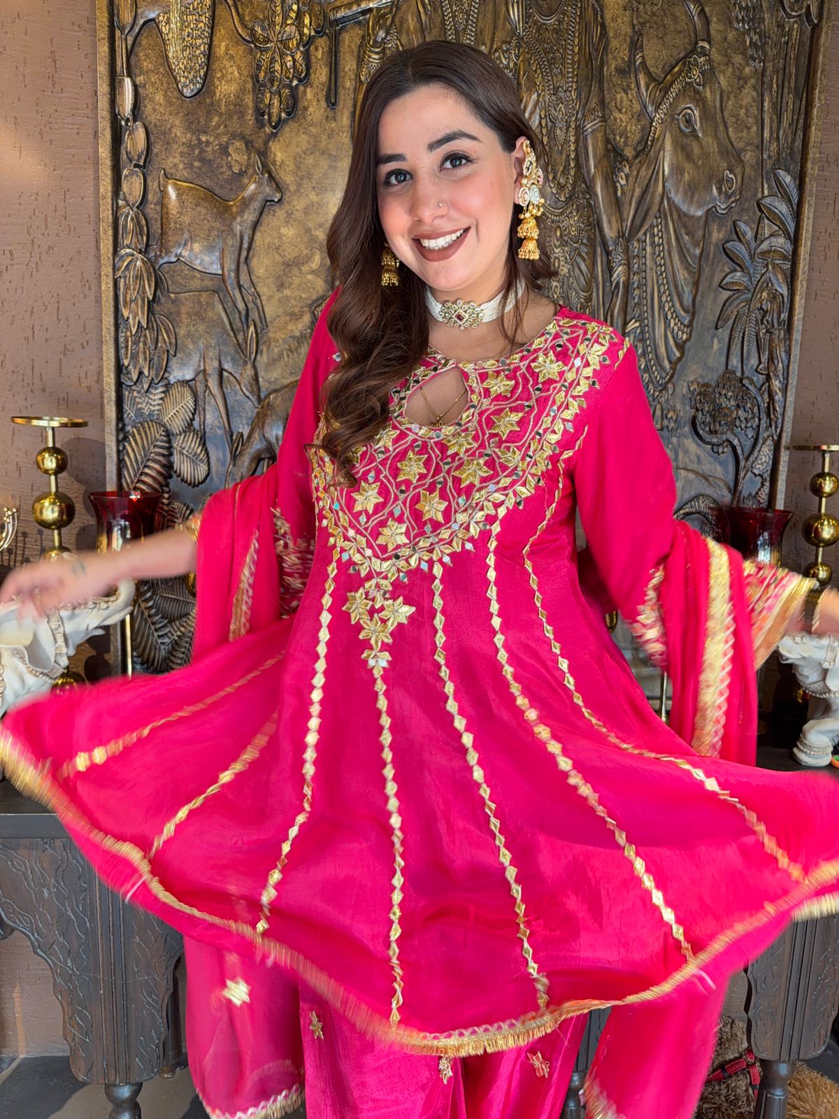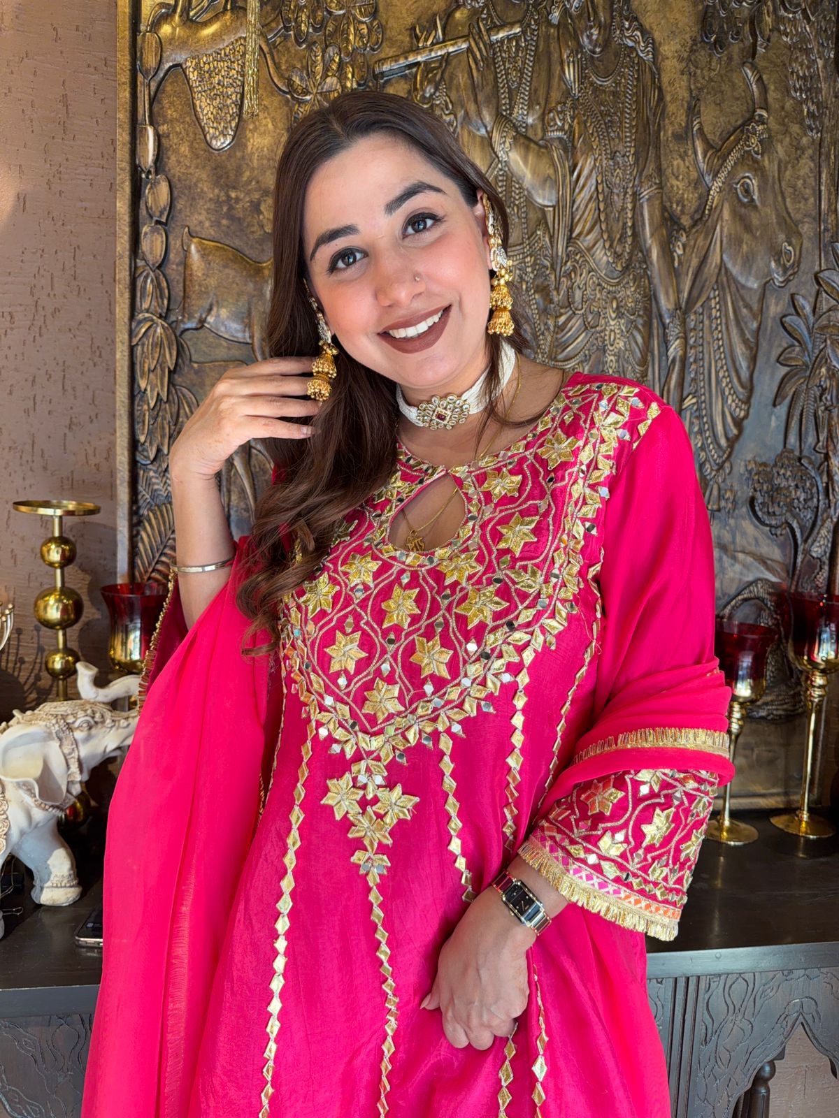 Mirrors are bordered with golden zari and gota patti embroidery.