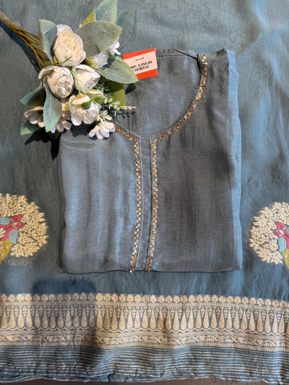 The Neck, Dupatta has Antique silver & champagne gold zari embroideries.