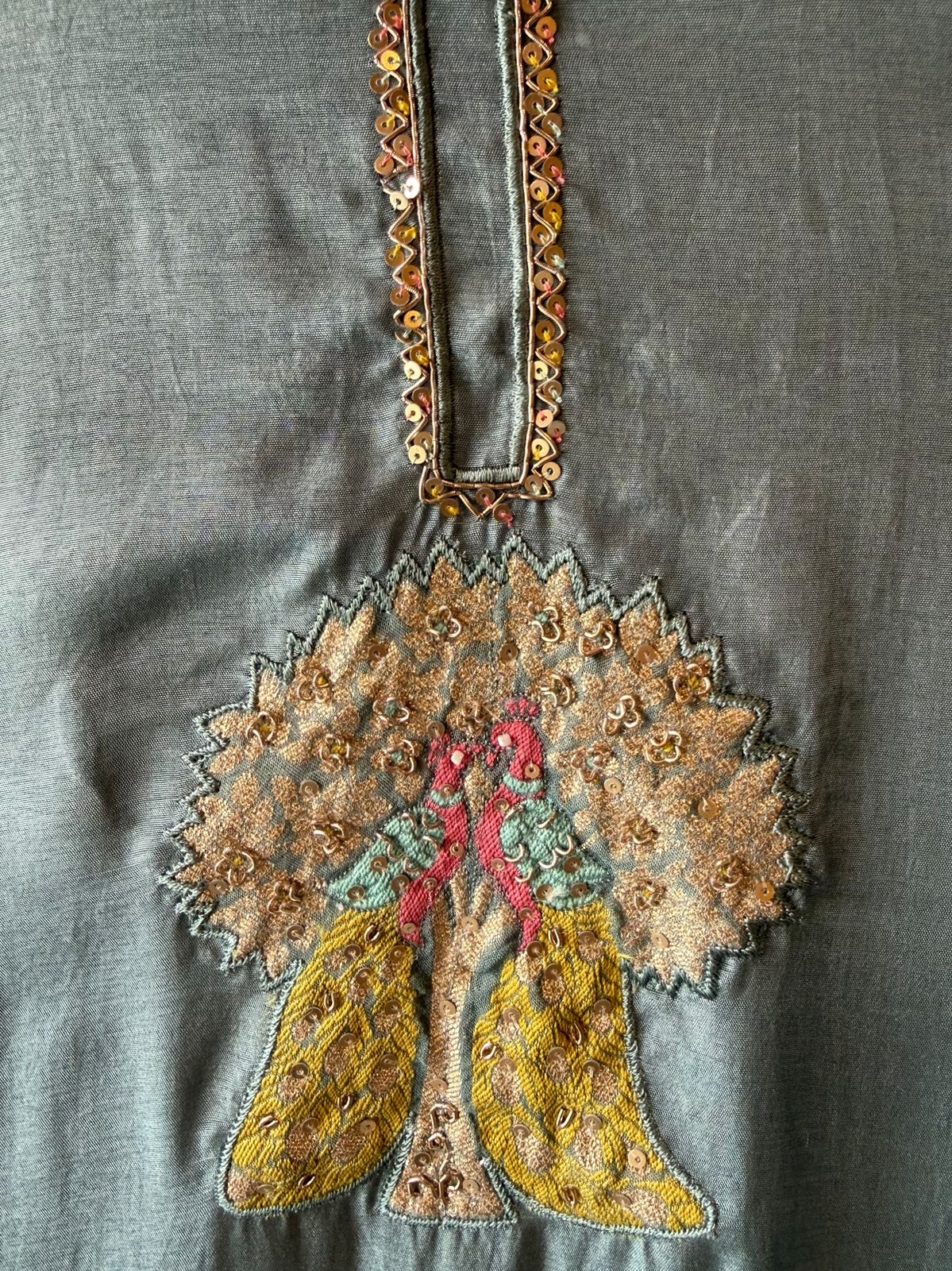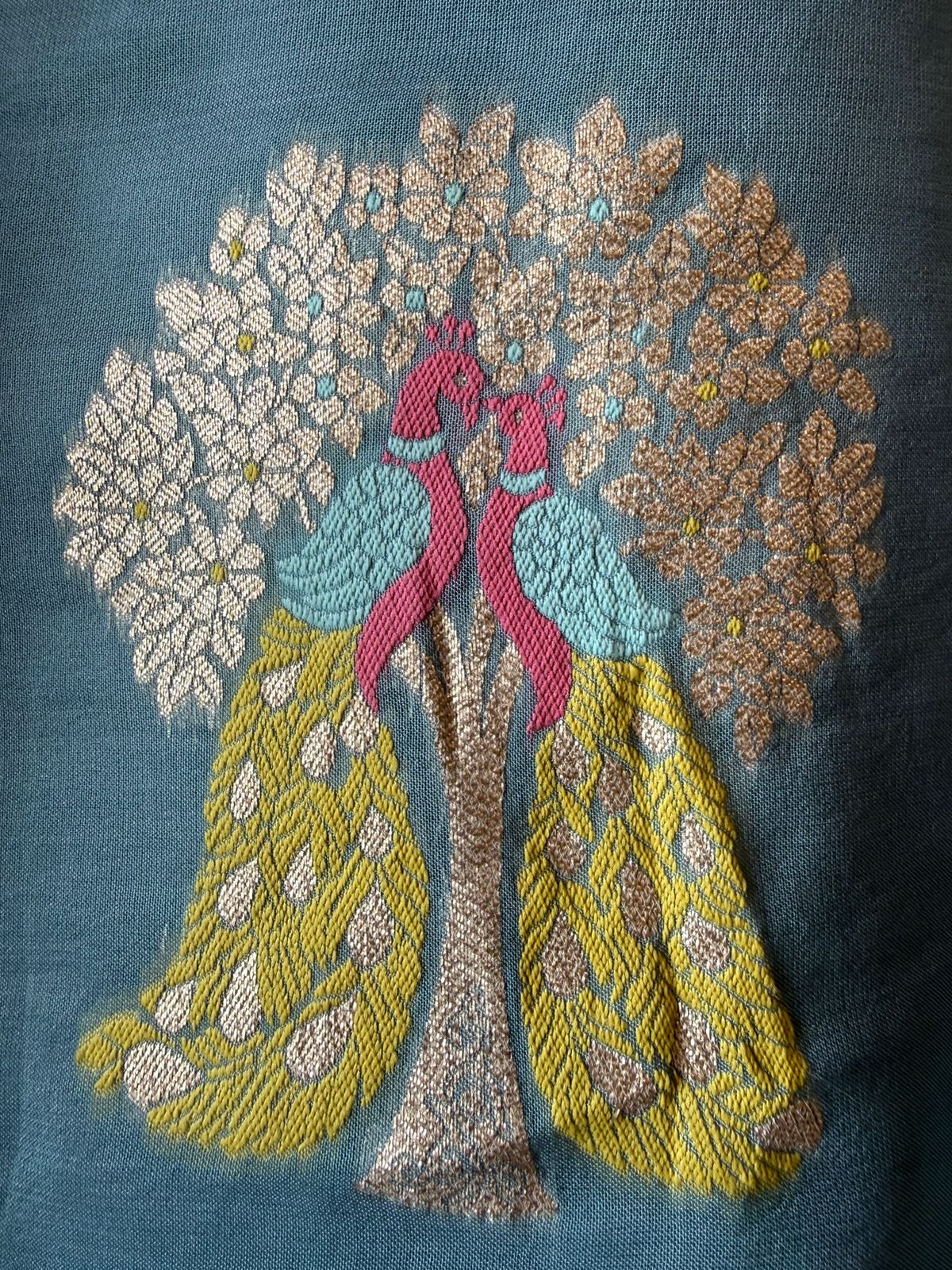 Central peacock motif with Zari embroidery (antique silver & gold tones)