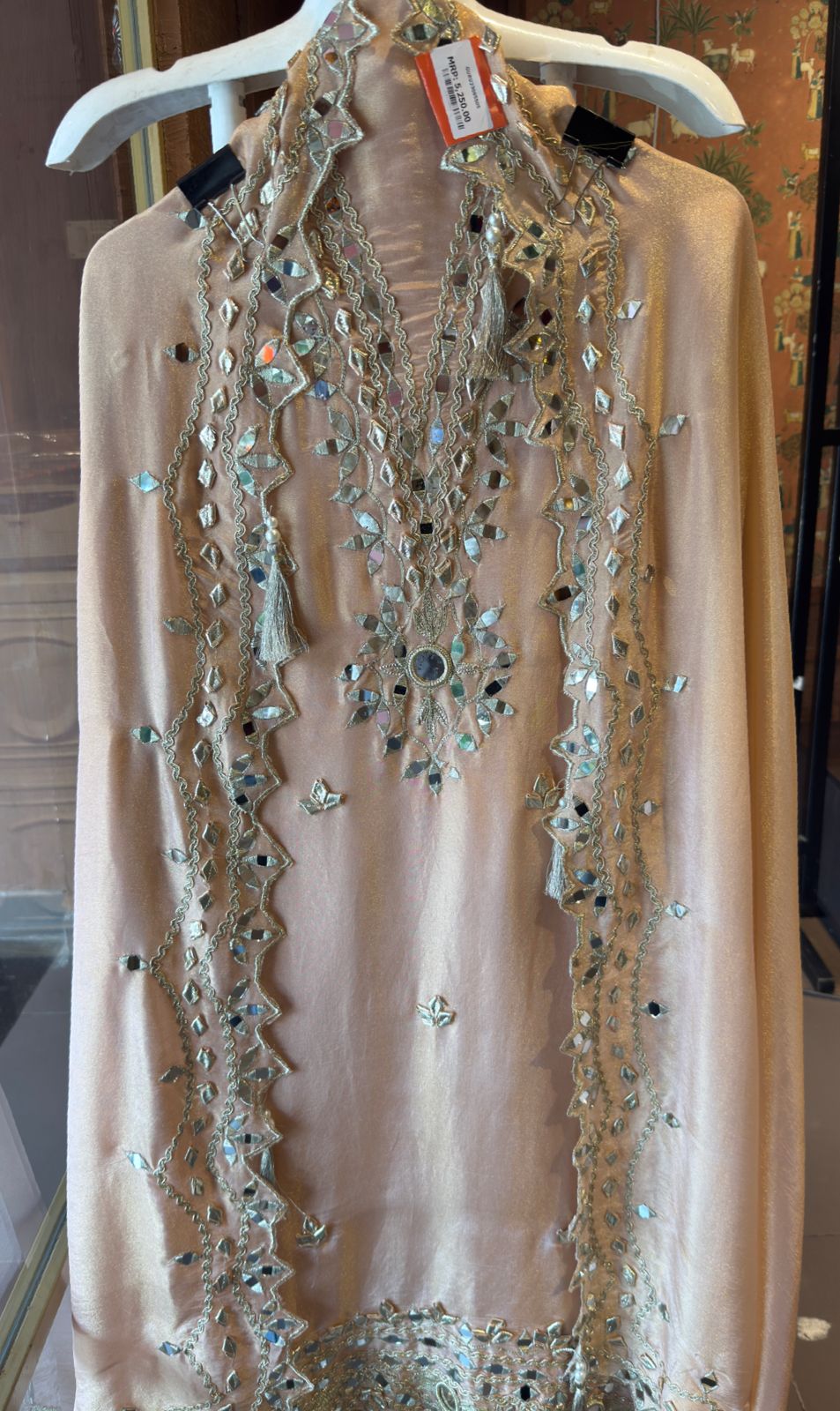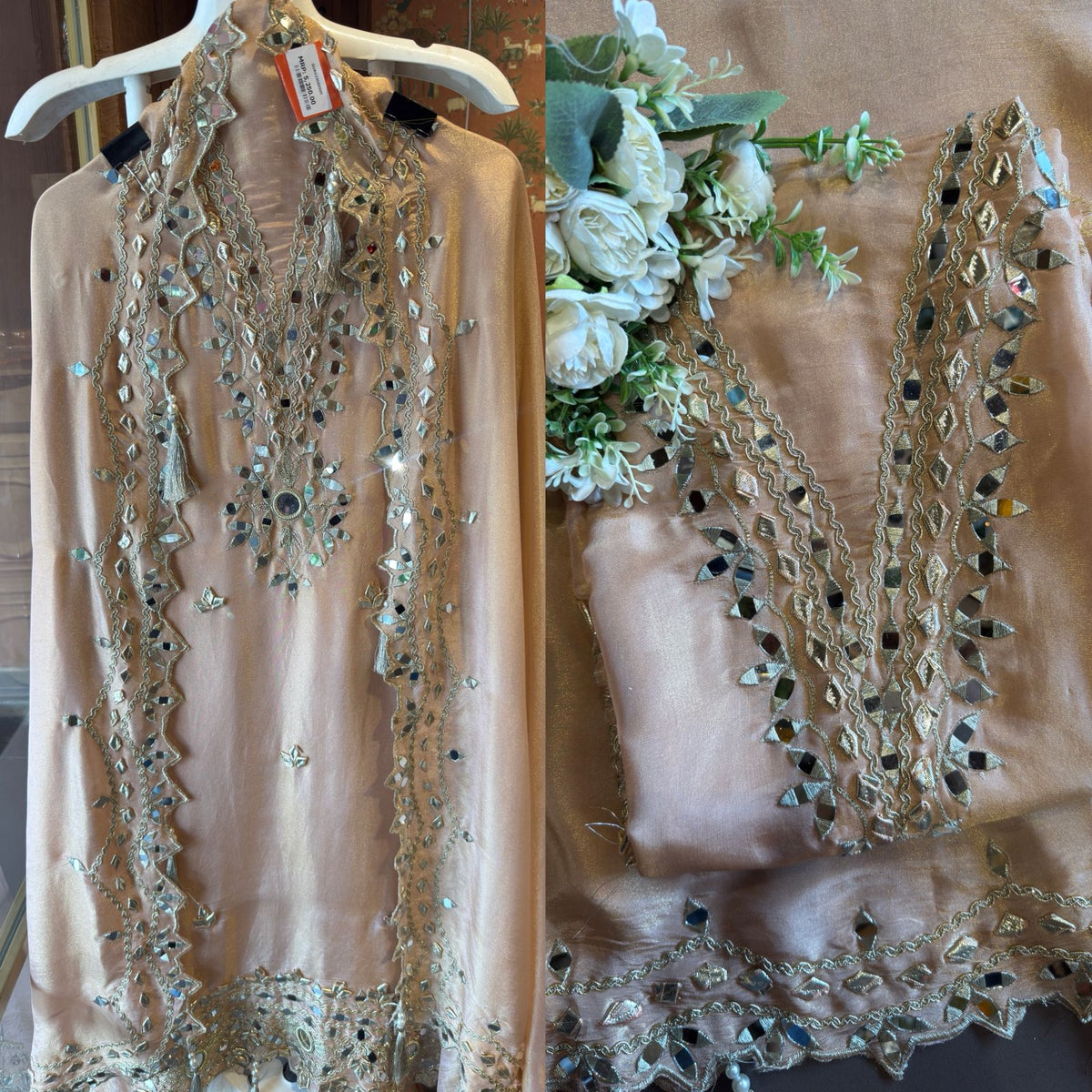 Embroidery work includes zari threadwork (in silver/golden tones), mirror work (shisha embroidery), and sequins.