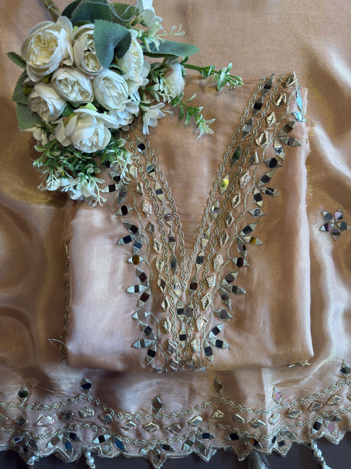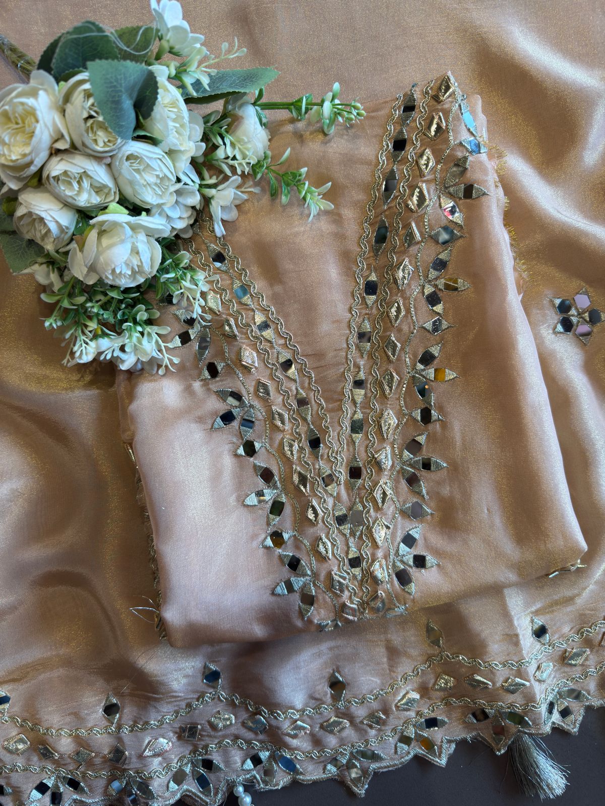 Shimmer dupatta with beautiful detailings with mirror and gotta work on  four sides border witj heavy scalloping done with Zari.