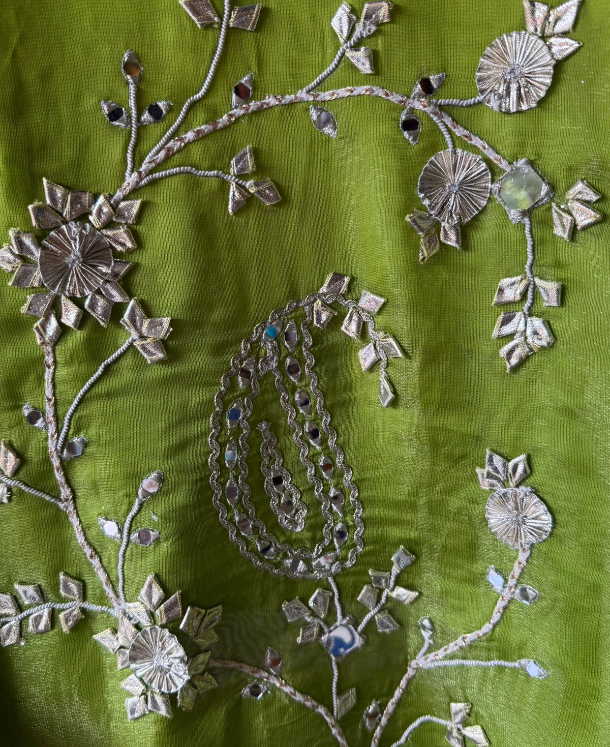 Silver zari and thread with gotta embroidery outlining the mirrors and forming paisley & floral designs.