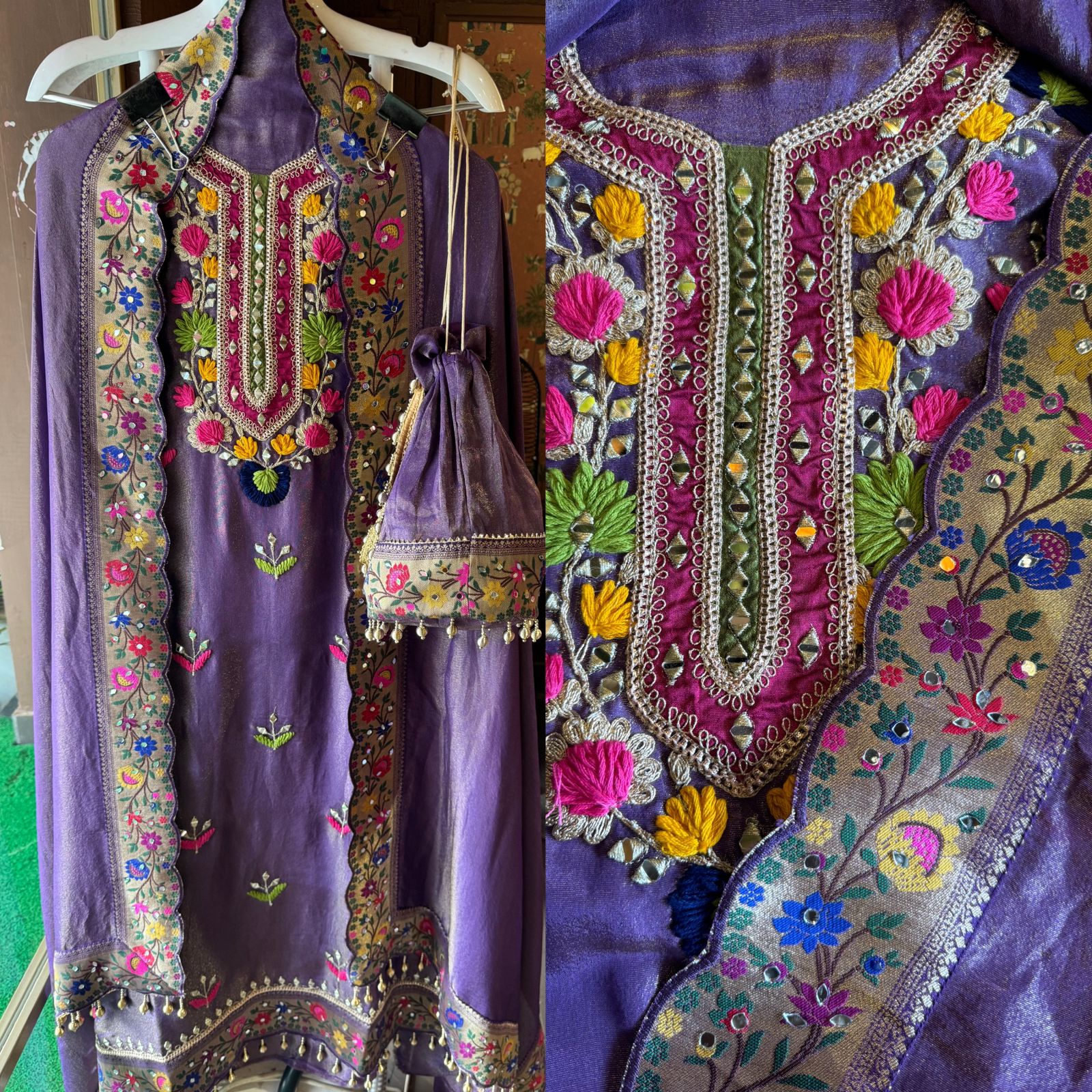Beautiful shimmer tissue Unstitched Full size shirt with multi Coloured thread embroidery done with the neckline and ghera with Moti lace attached on the ghera.