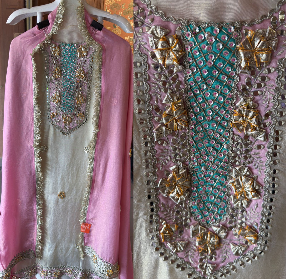 The neckline has Intricate embroideries including gotta work, Mirror work and Dori.