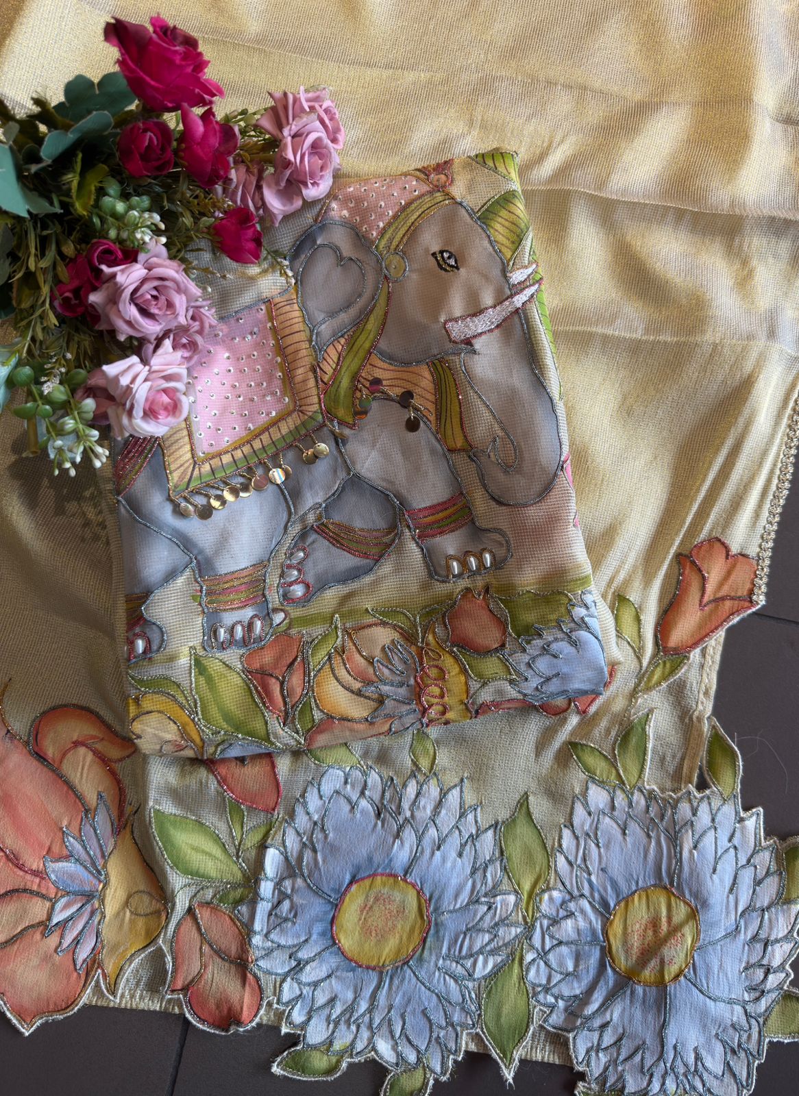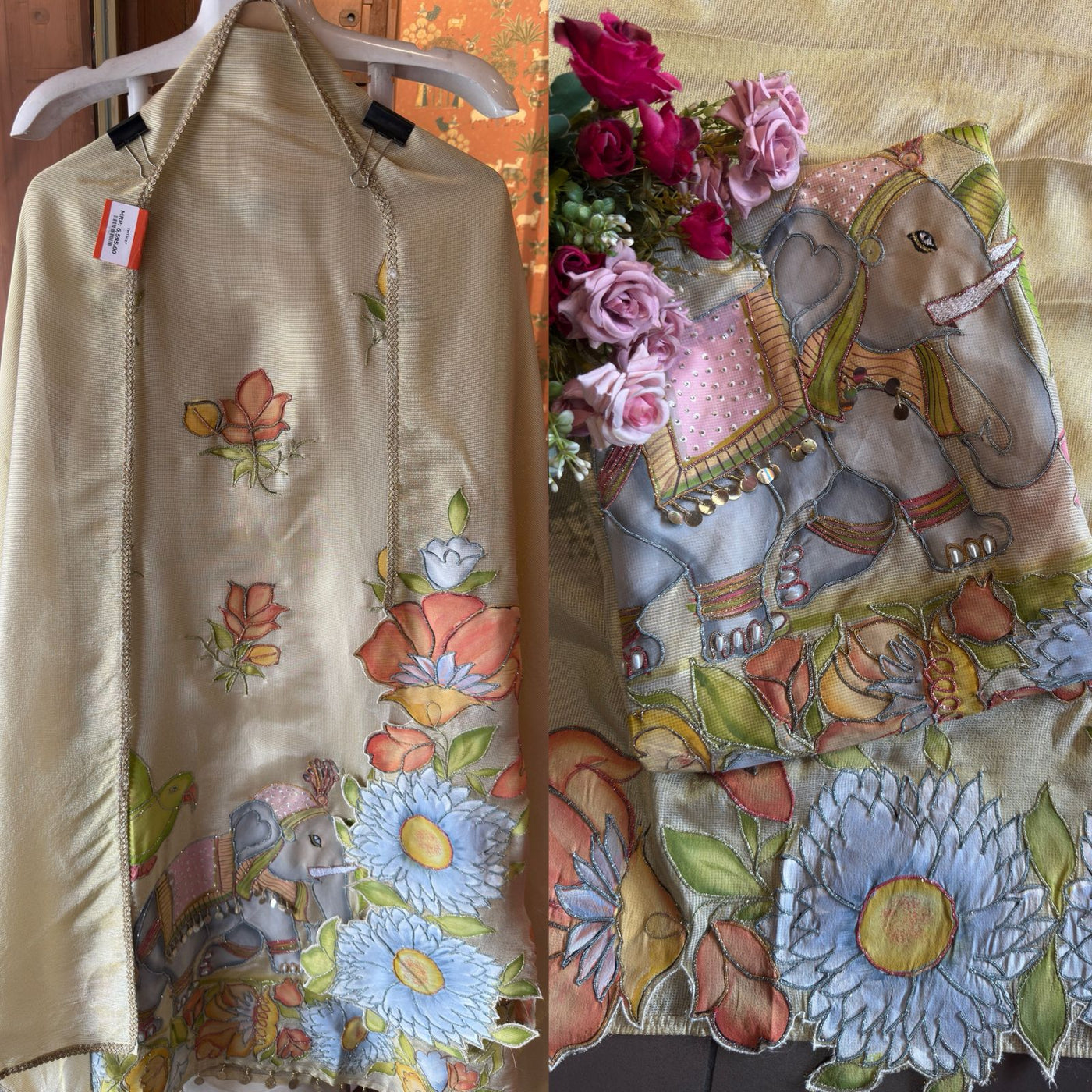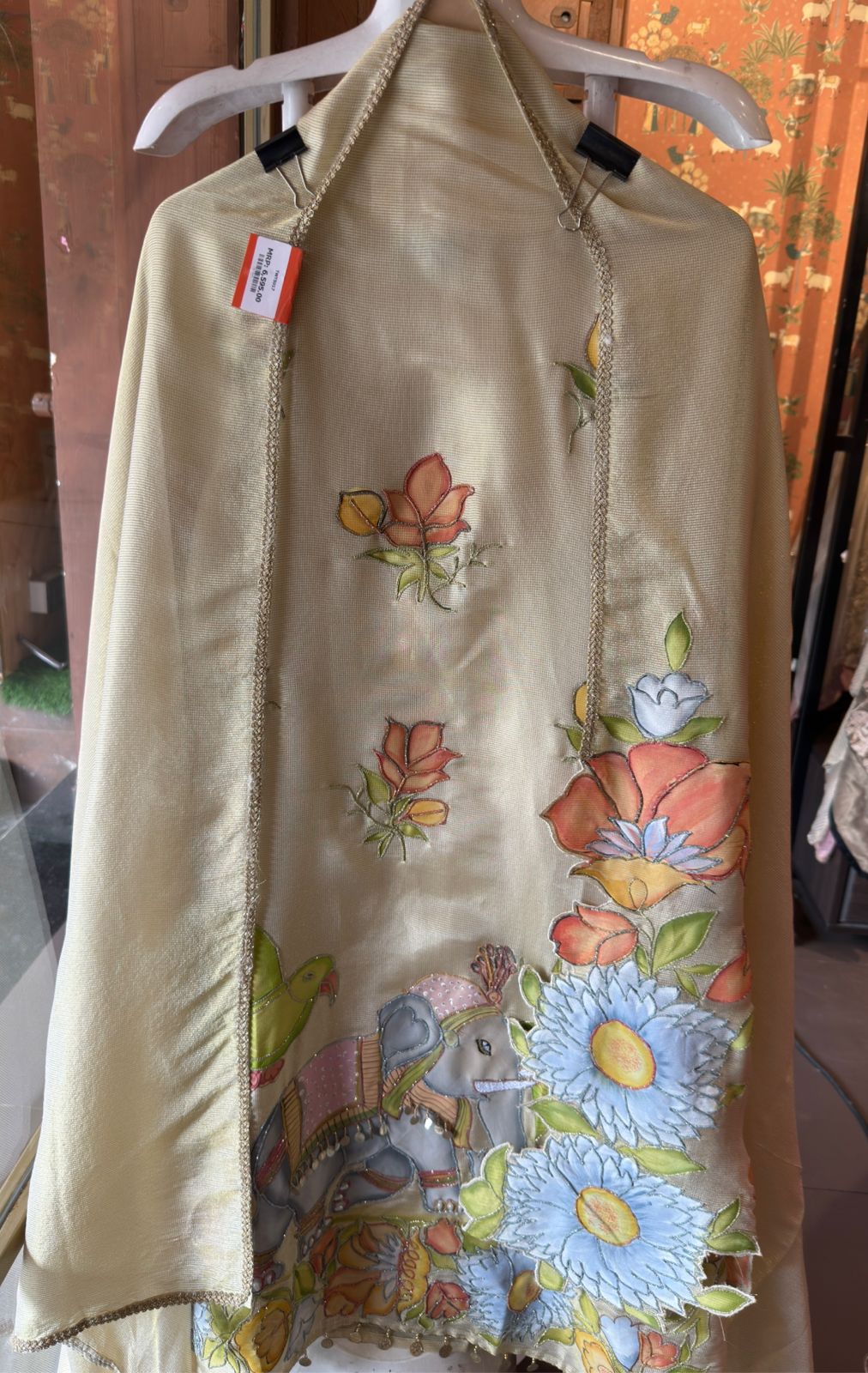 Ends of the dupatta has a beautiful detailed Handpainted cutwork flower design highlighted with Zari.