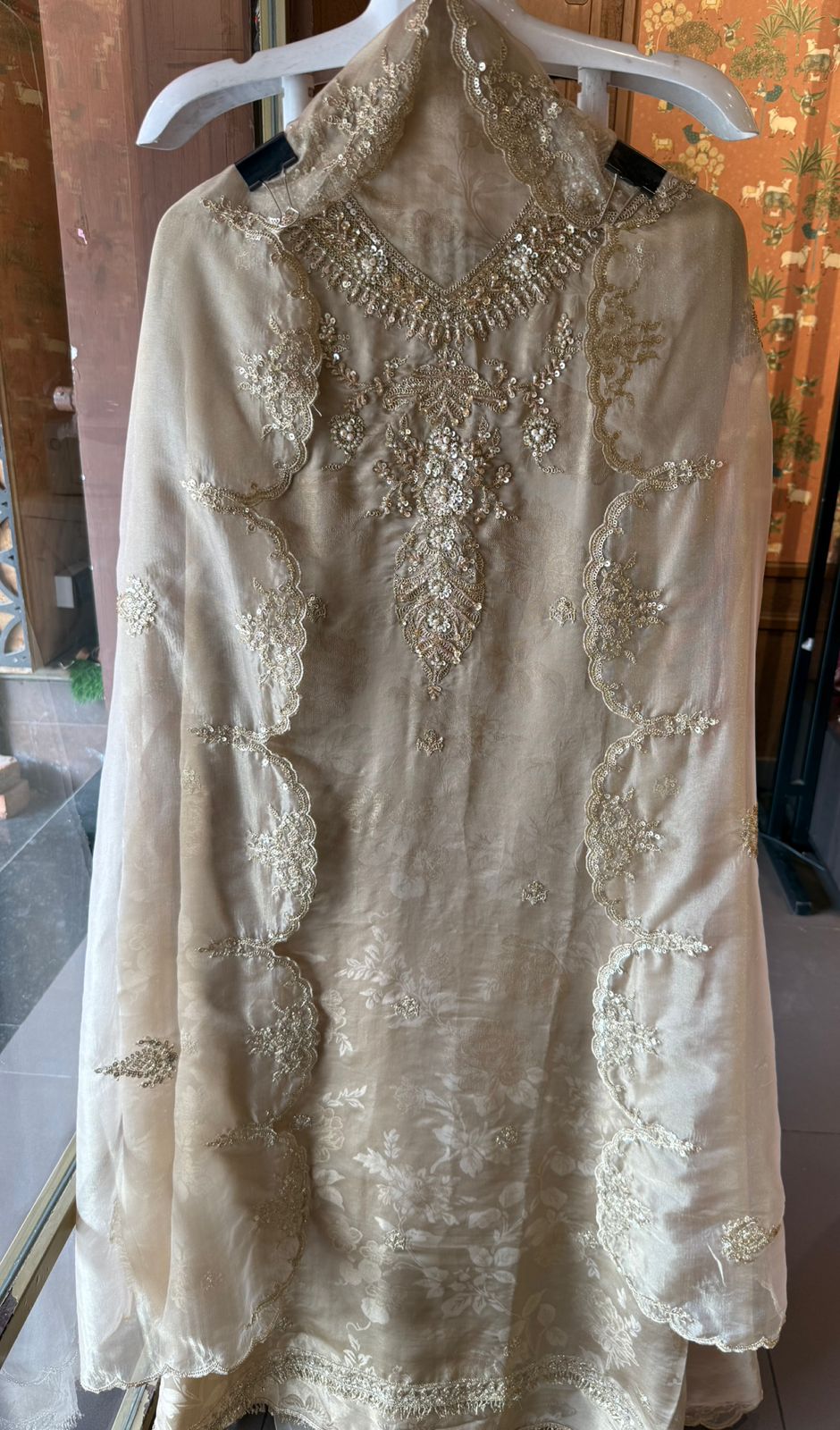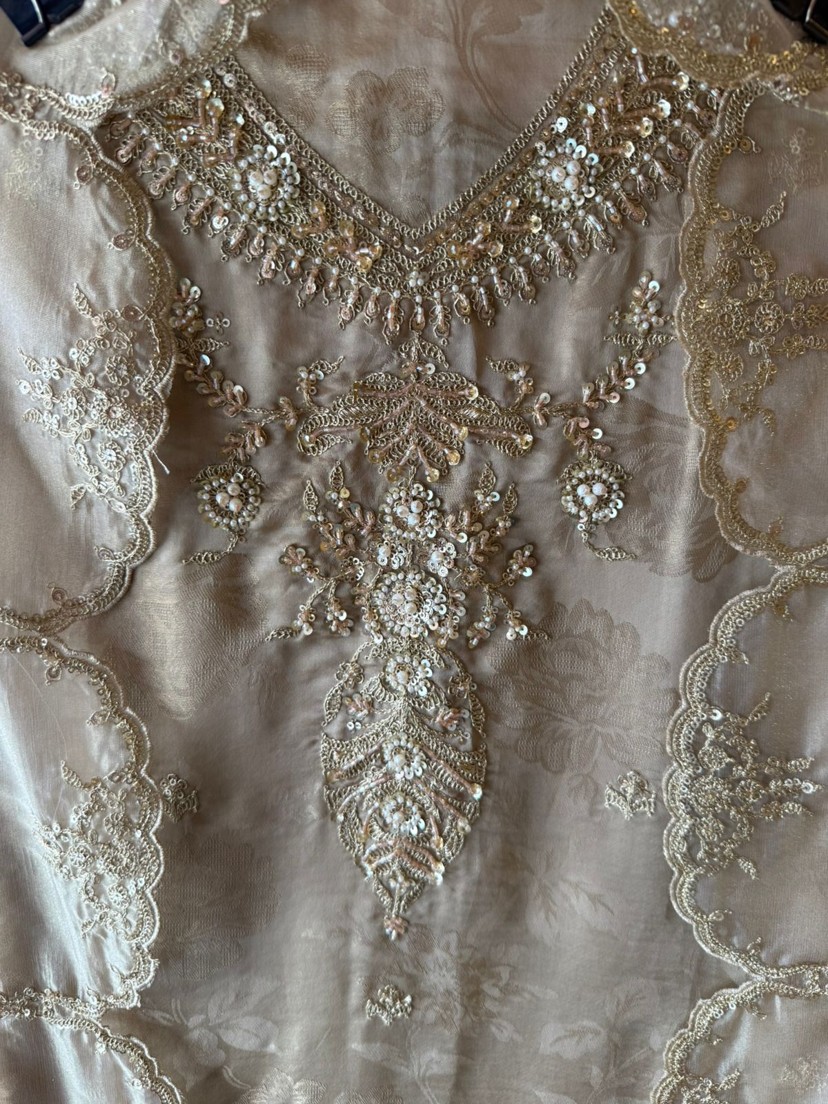 Organza dupatta Embellished with sequins, pearls, beads, and cutdana, creating a high-shine yet refined finish on the four side borders.