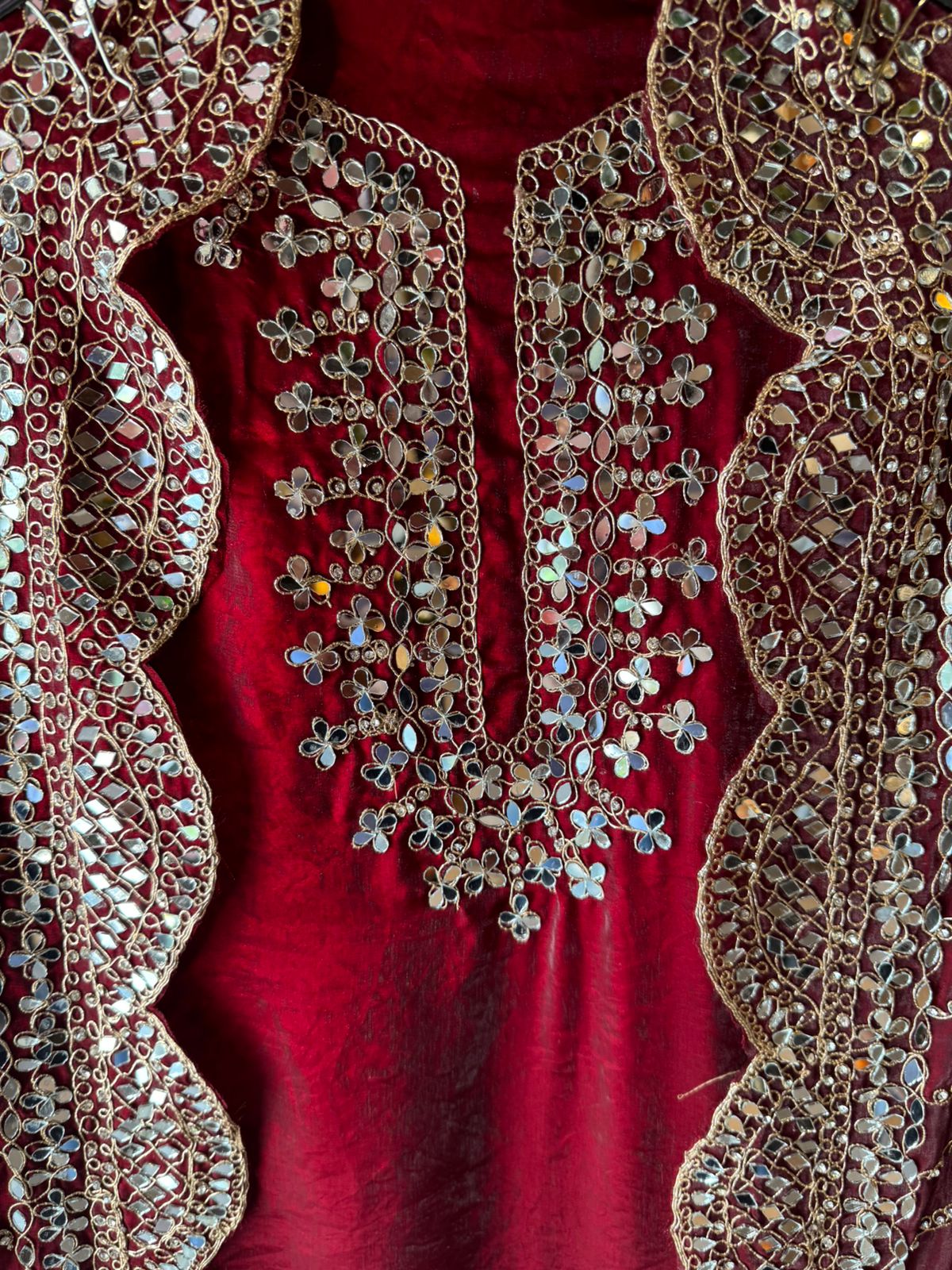 Heavy mirror work (shisha embroidery) dominates the outfit, bordered by fine zari and Dori detailing.