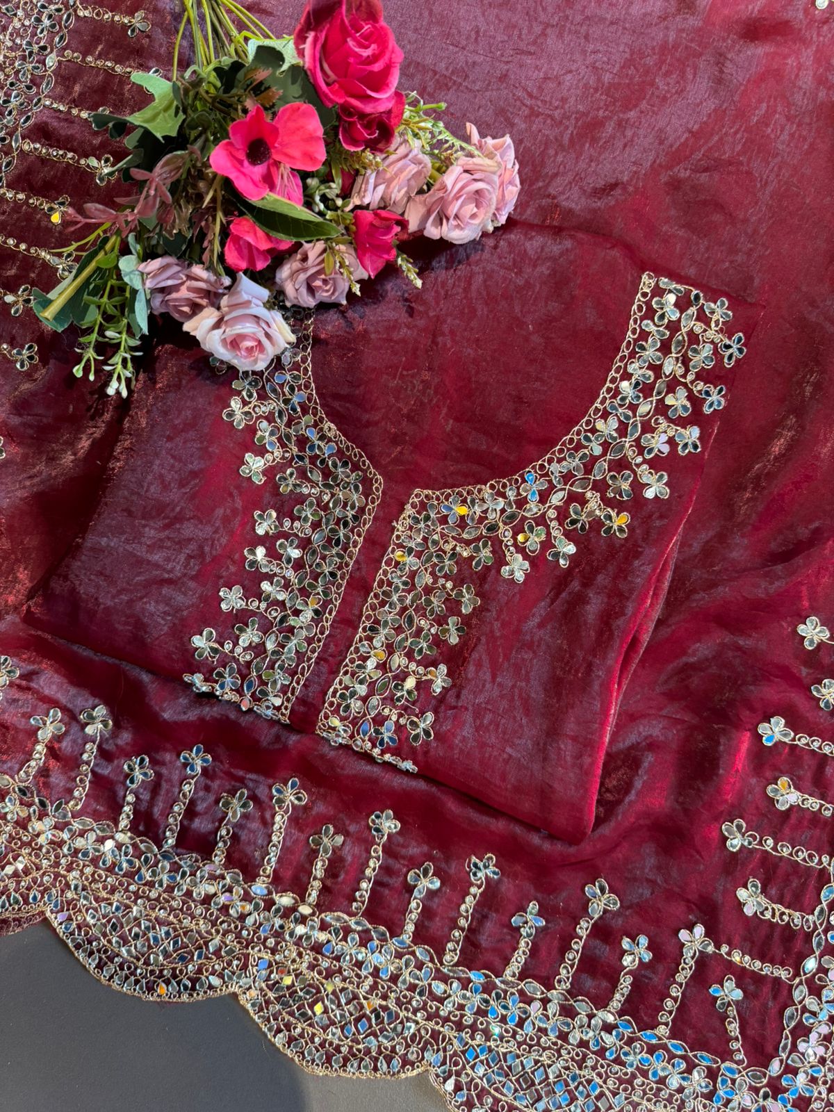 pure glass tissue shirt with Very beautiful mirror work detailings on the neckline and ghera of the shirt with soft scalloping on the ghera.