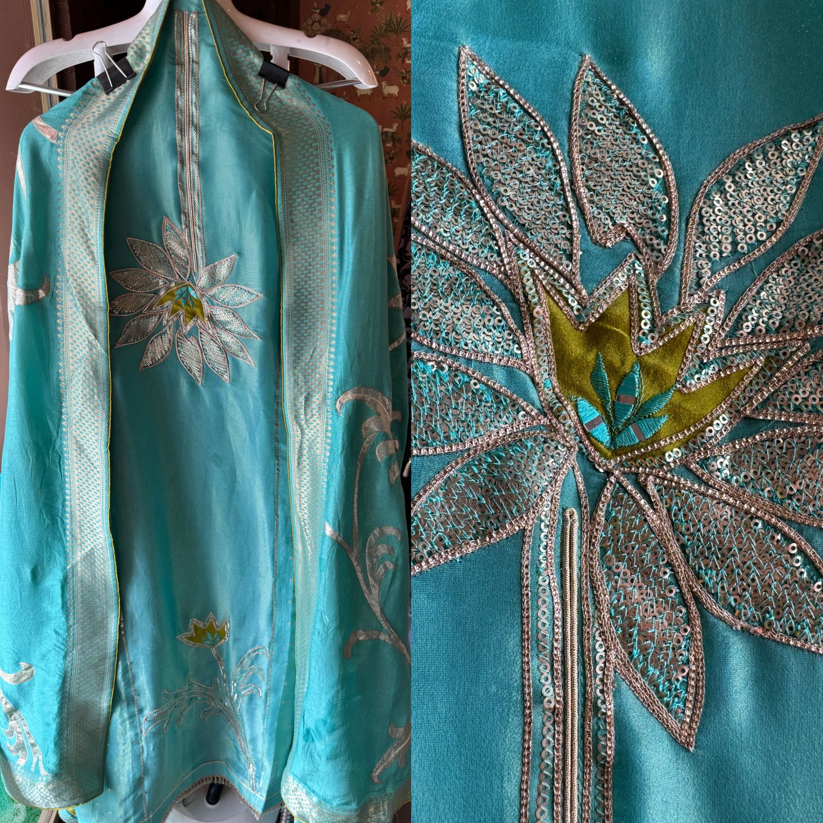 Full size tissue dupatta with shimmer patchwork done with mirror work detailings and Banarsi weaving on the borders.