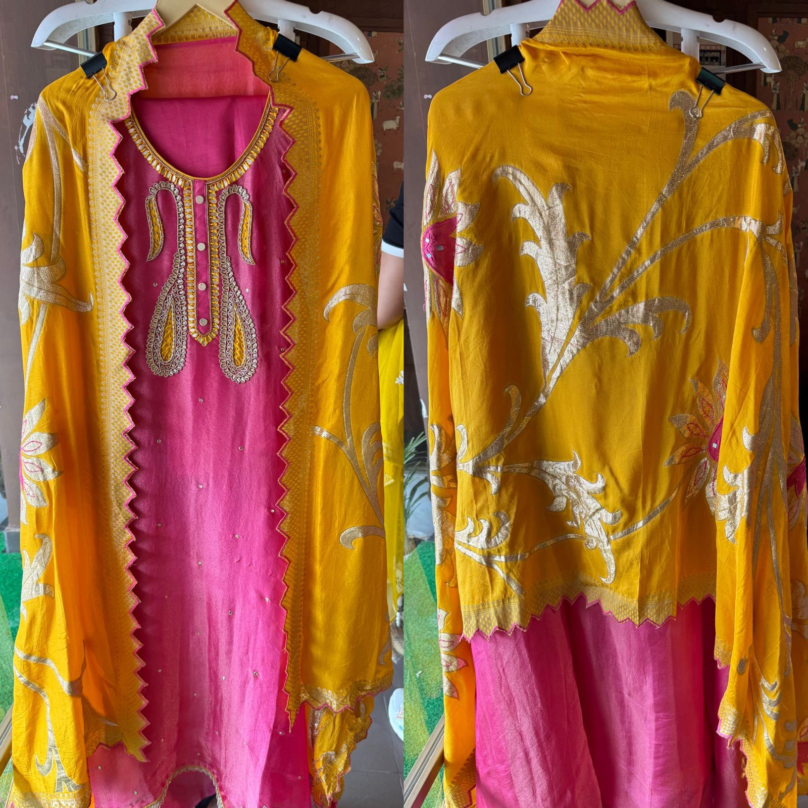 Pure Shimmer tissue Unstitched Shirt with Moti work on the neckline with thread and gotta patti detailings as well.