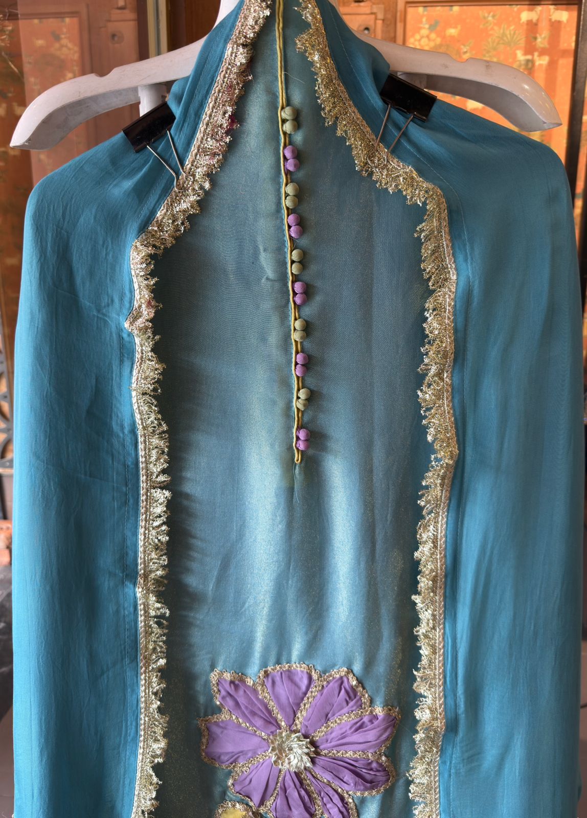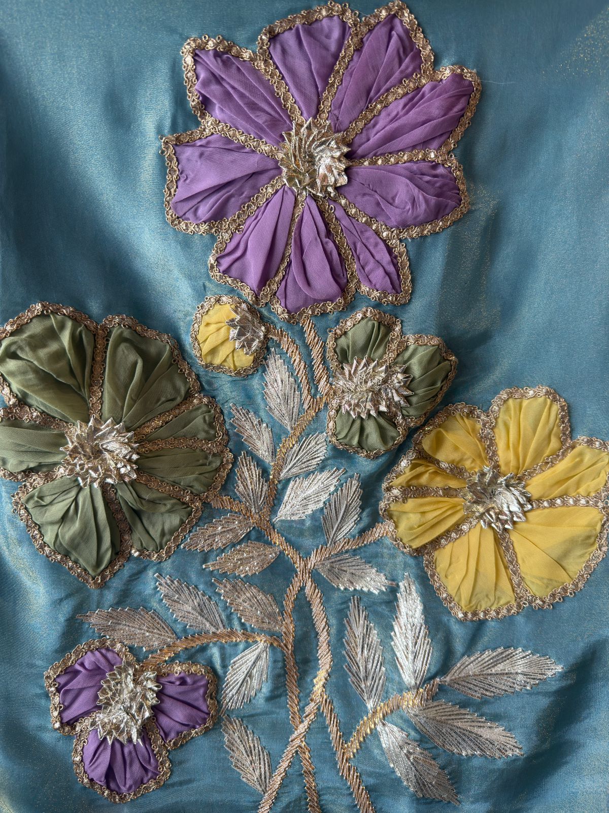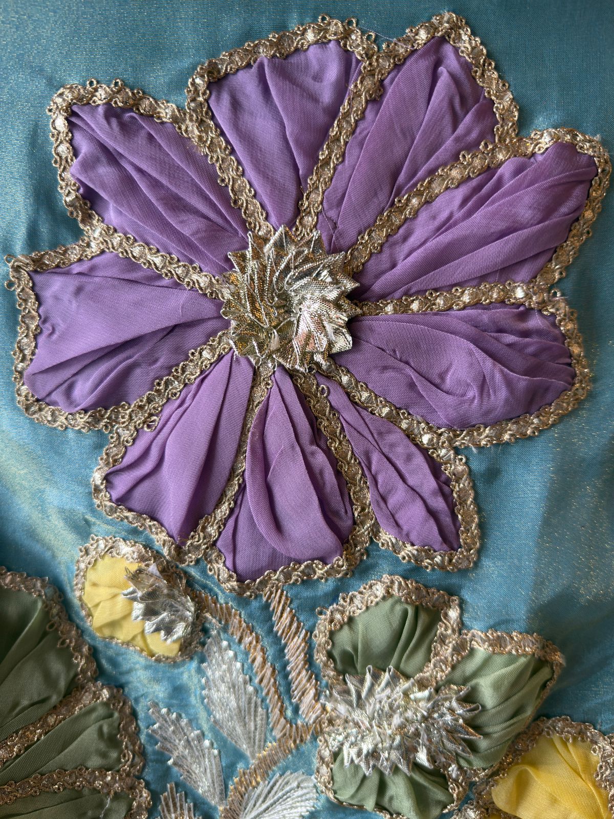 • Multicolor floral embroidery bordered with scalloped edges in gold, Mauve, and Green.