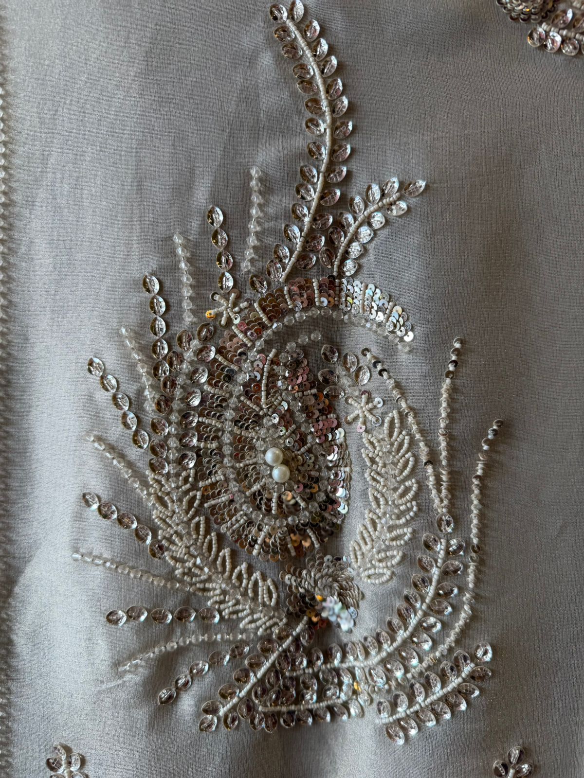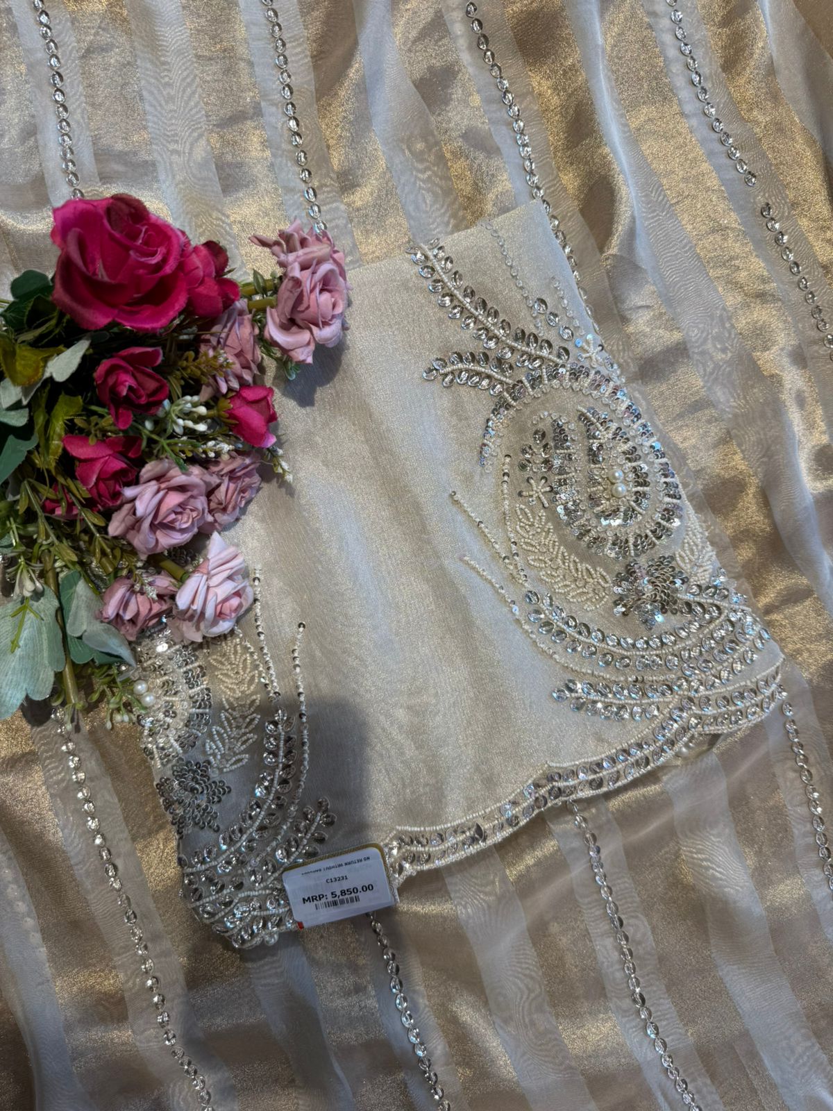 Tissue plain shirt unstitched with bead embellished neck Patti design with motifs scattered on the shirt front.