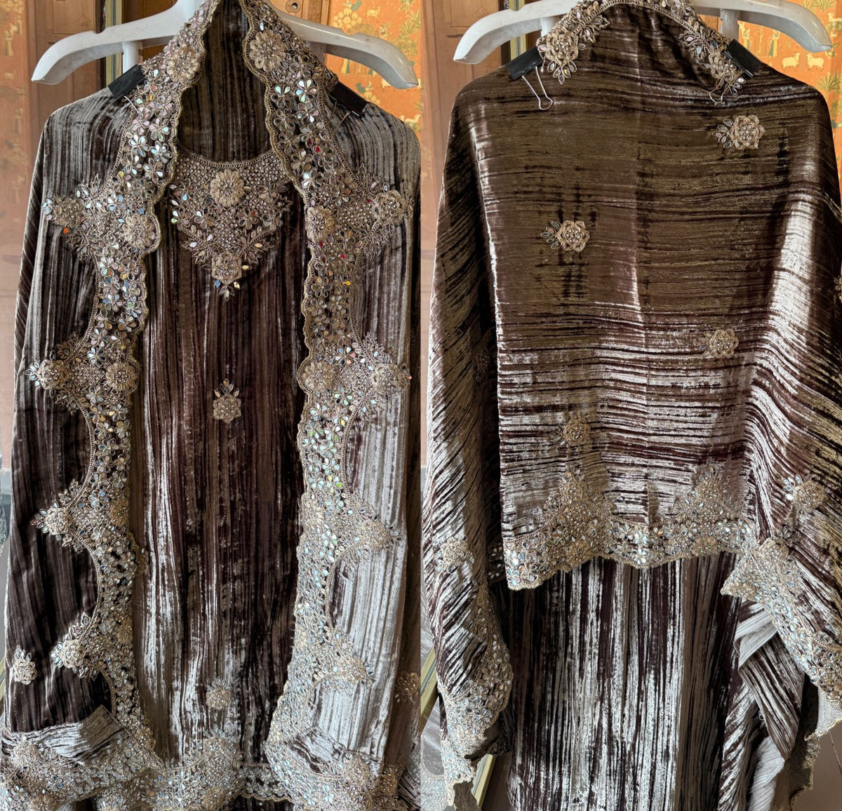 Crushed velvet Unstitched Suit sets with deep U neck, Embellished with jarkan stone’s,Zari and Dori work.