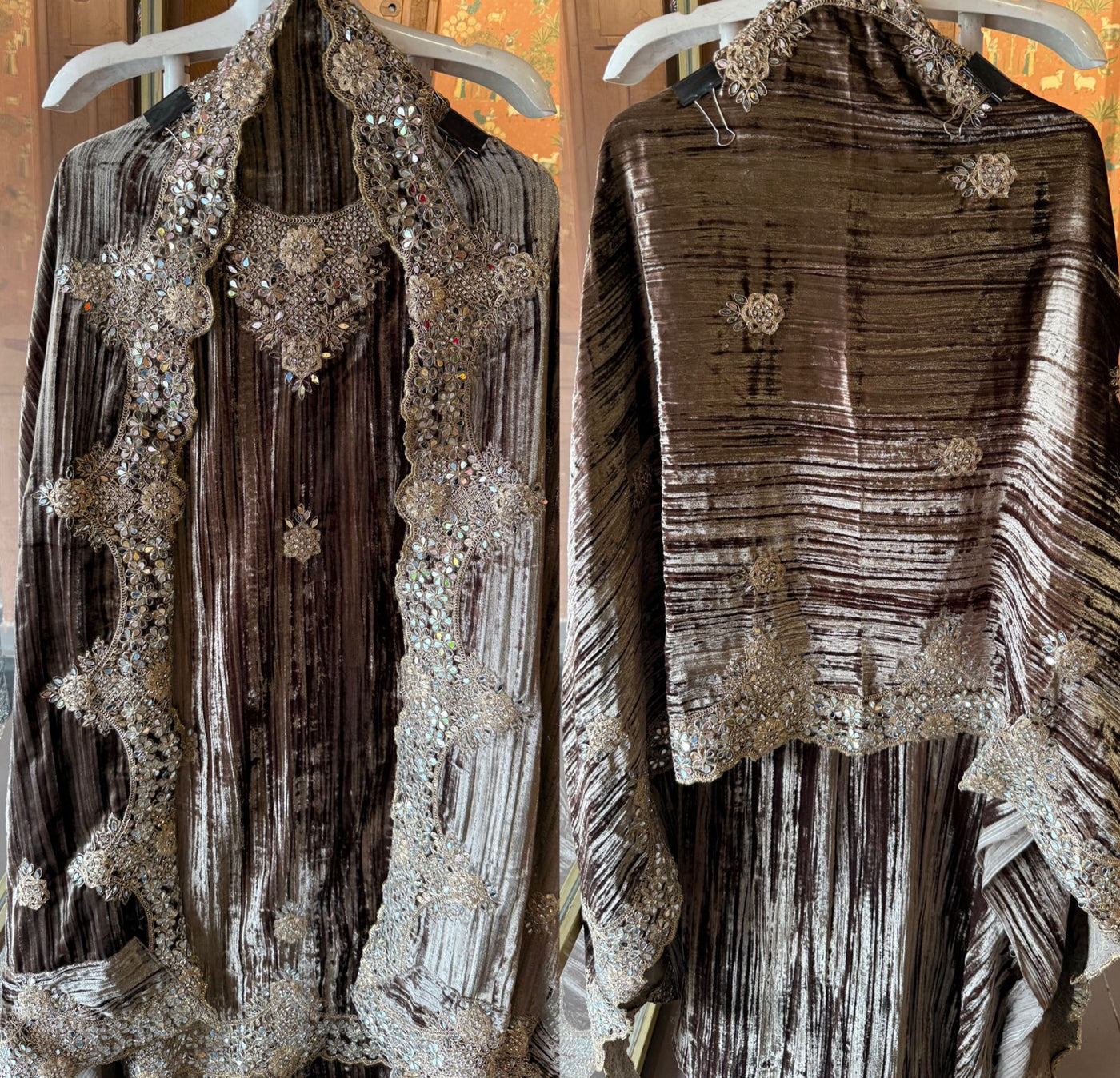 Crushed velvet shawl with designer borders, Highligted with Stones and mirrors and Dori work.