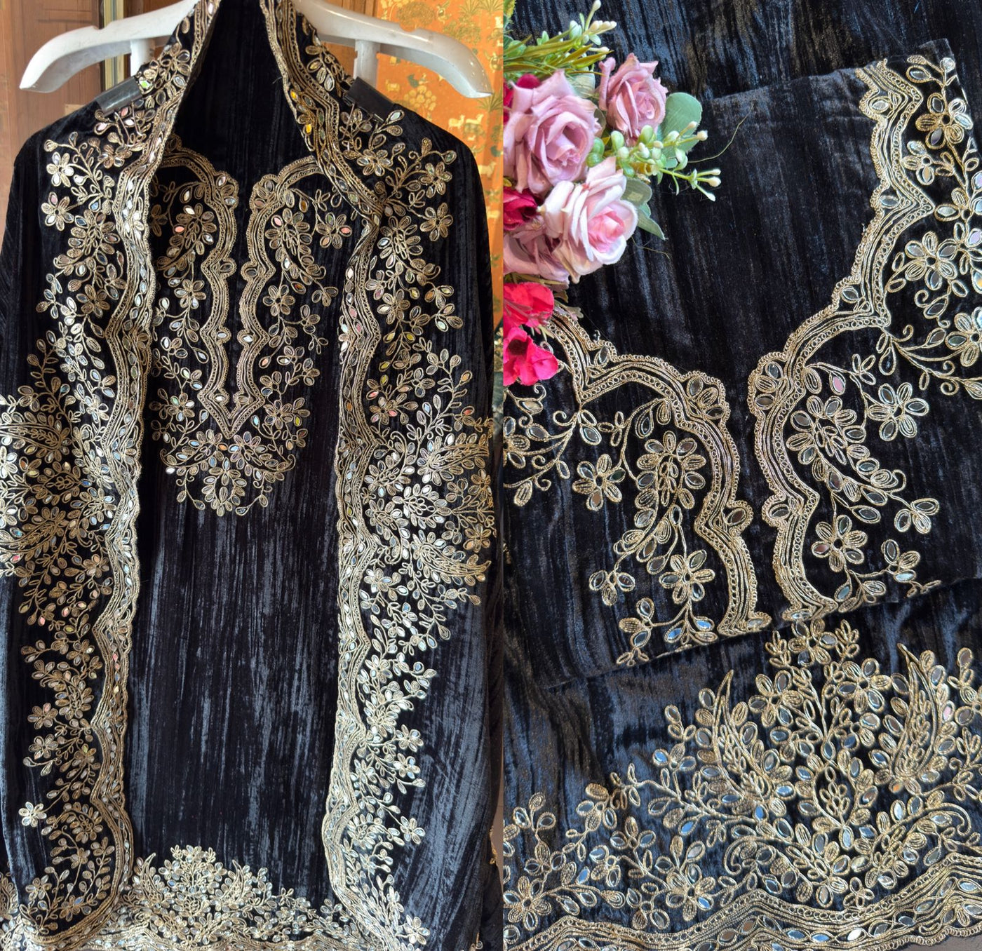 Crushed Velvet Unstitched Suits with beautiful original mirror work & Dori work used.