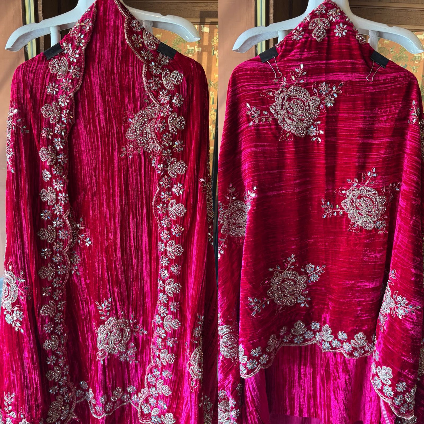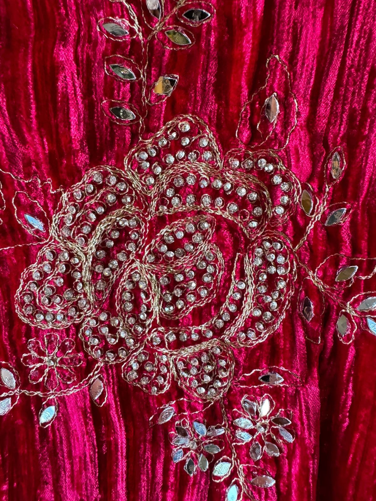 Crushed velvet shawl with four sides heavily embroidery done with mirror and stone work highlighting.