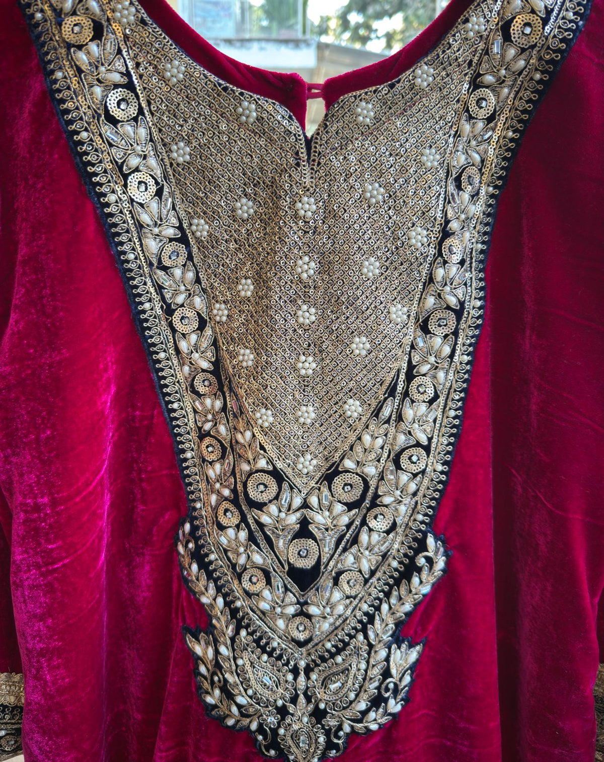 Leaf motifs worked intricately at the base of the neckline (signature Mughal-inspired detailing)