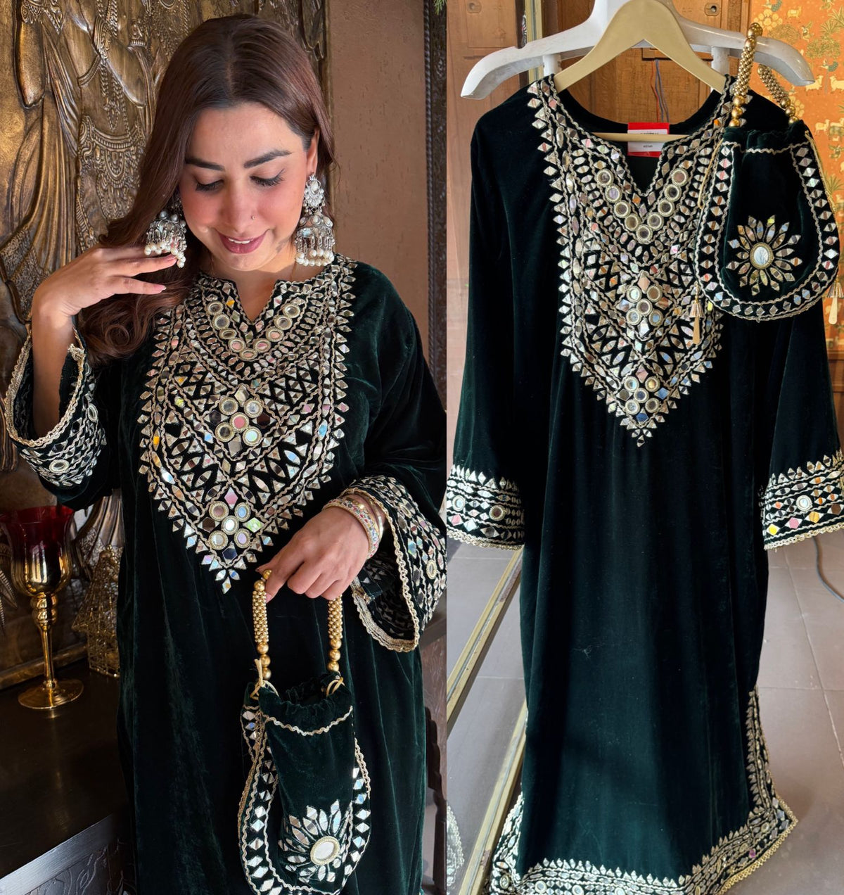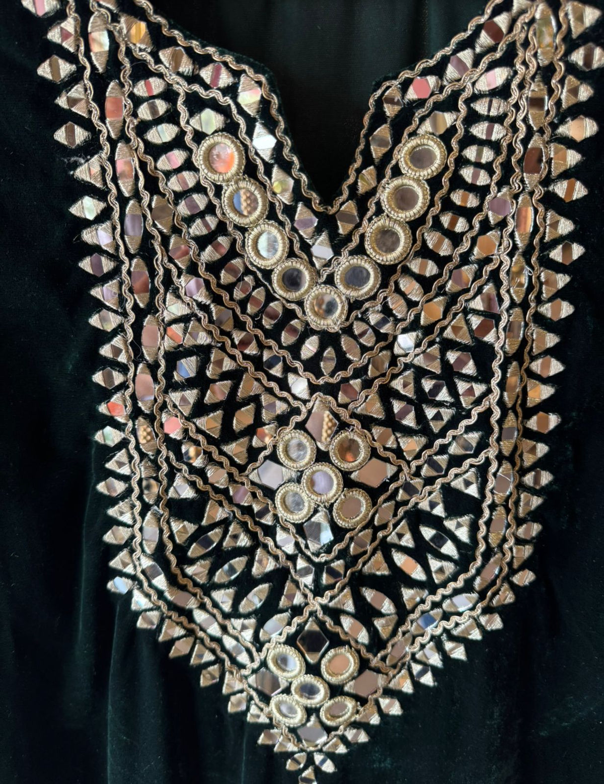 Heavy mirror work (shisha embroidery) on neckline, sleeves, and lower hem