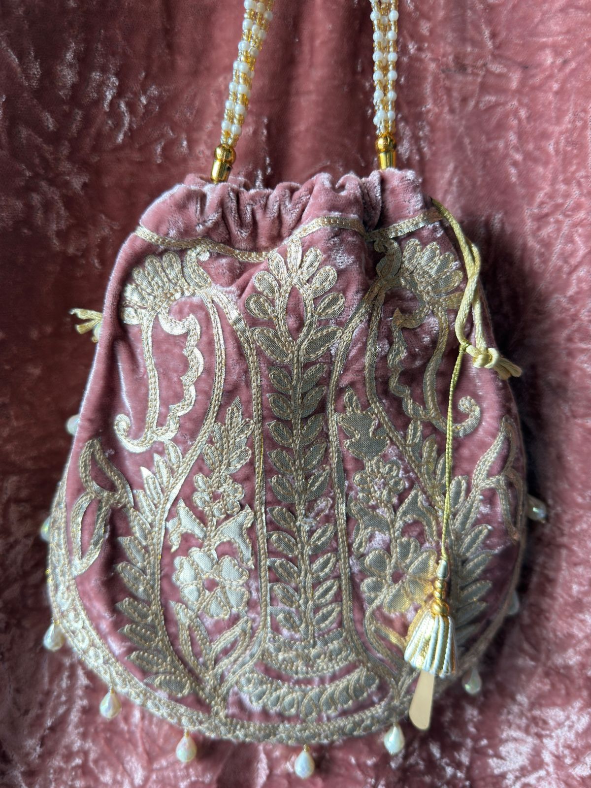 Hem finished with small pearl/ghungroo-like dangling beads