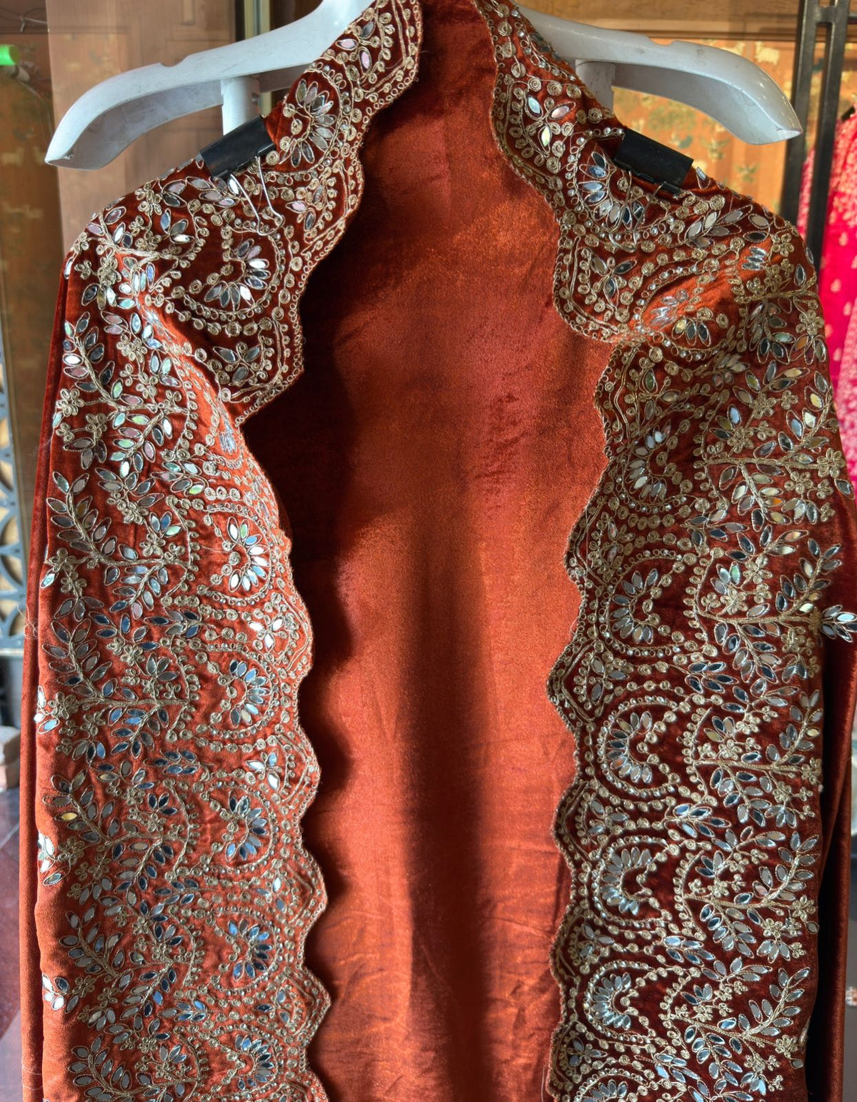 Solid colour velvet shawl decorated with original mirror work and Zari embroideries.