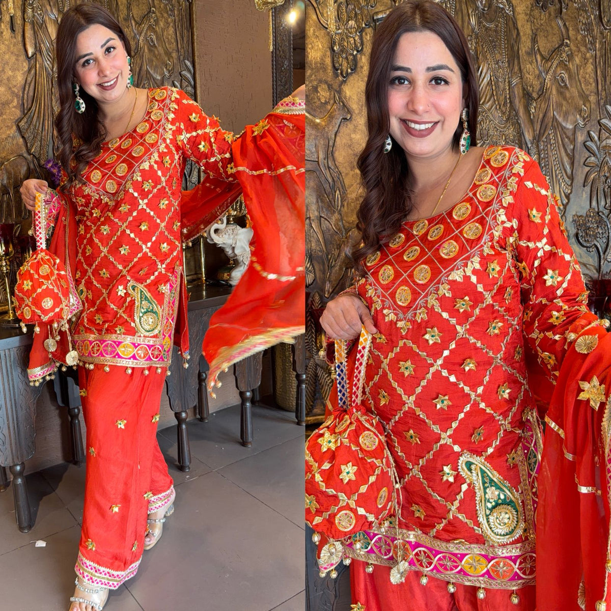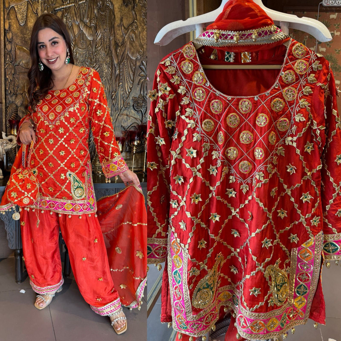 Golden zari and gota patti work create a (jaal) pattern throughout the kurta.