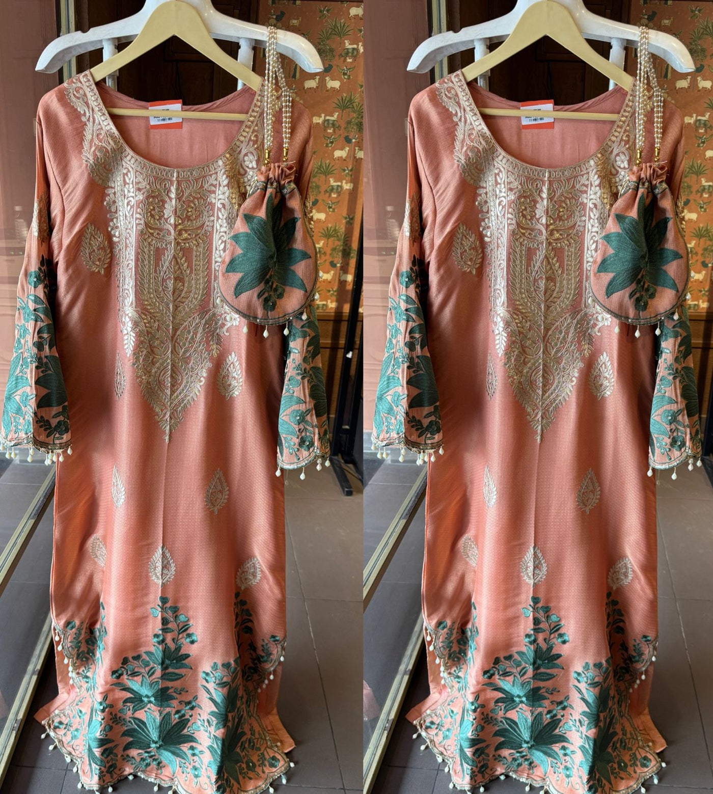 Beautiful ethnic long dress set with rich contrasting embroidery, giving it a regal and elegant appeal.