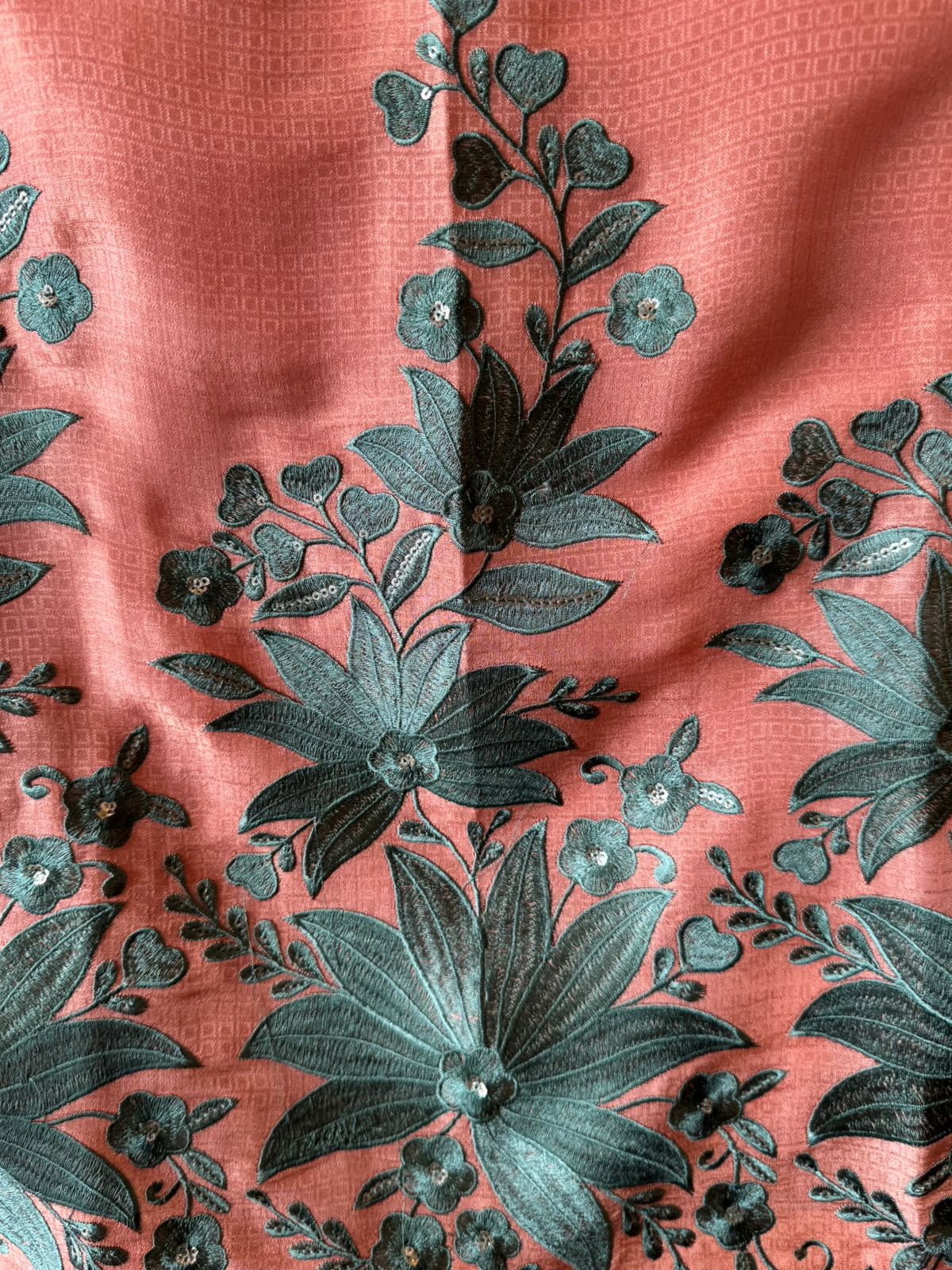The embroidery is done in a paisley + floral motif style, giving a regal touch.