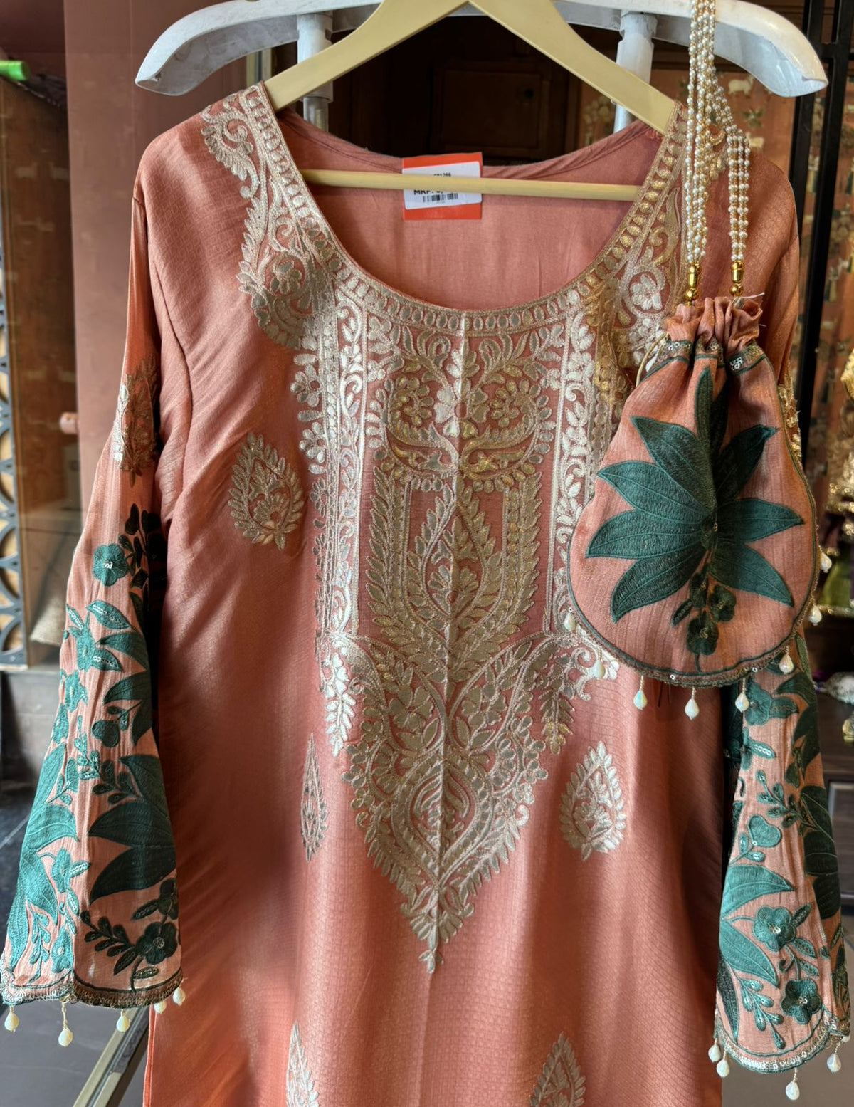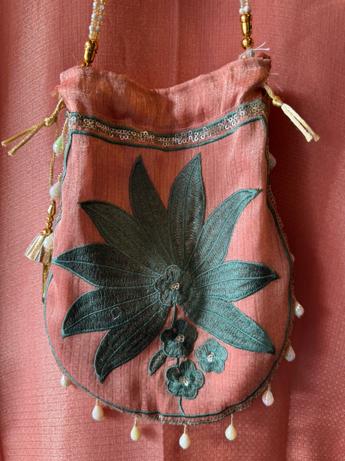 Complimentary Potli bag with bead lace and Embroidered flower motif.