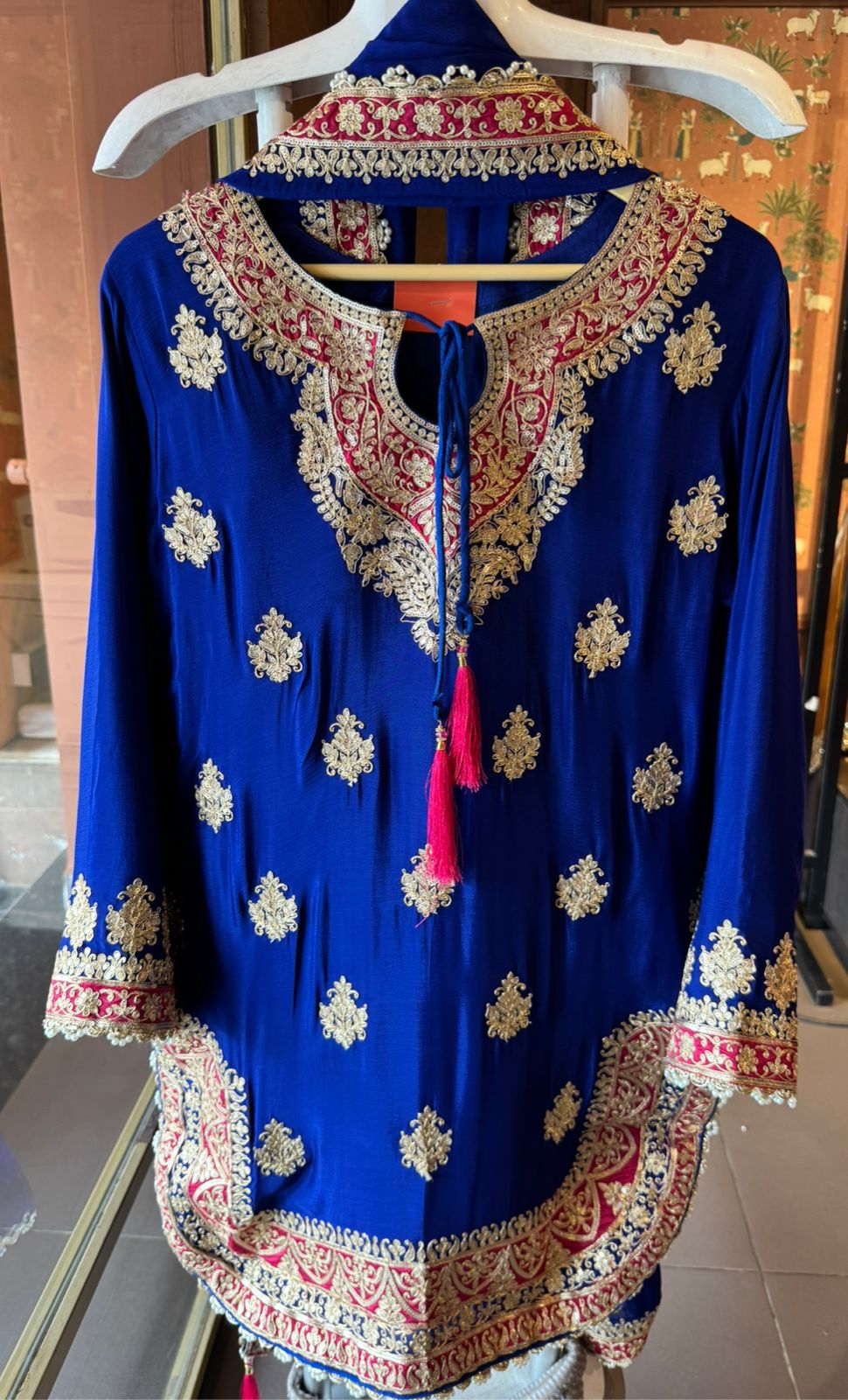 The sharar’s are fully heavily embroidered with Dori and Zari work.