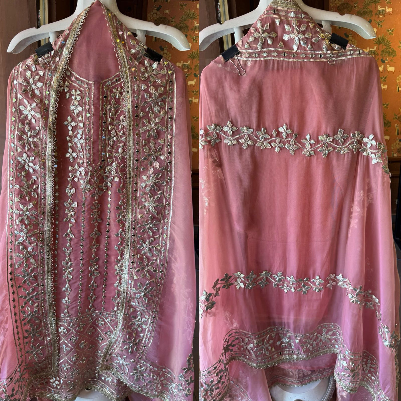 Dense floral motifs created with Original Gotta work, mirror work, silver zari, and thread embroidery.