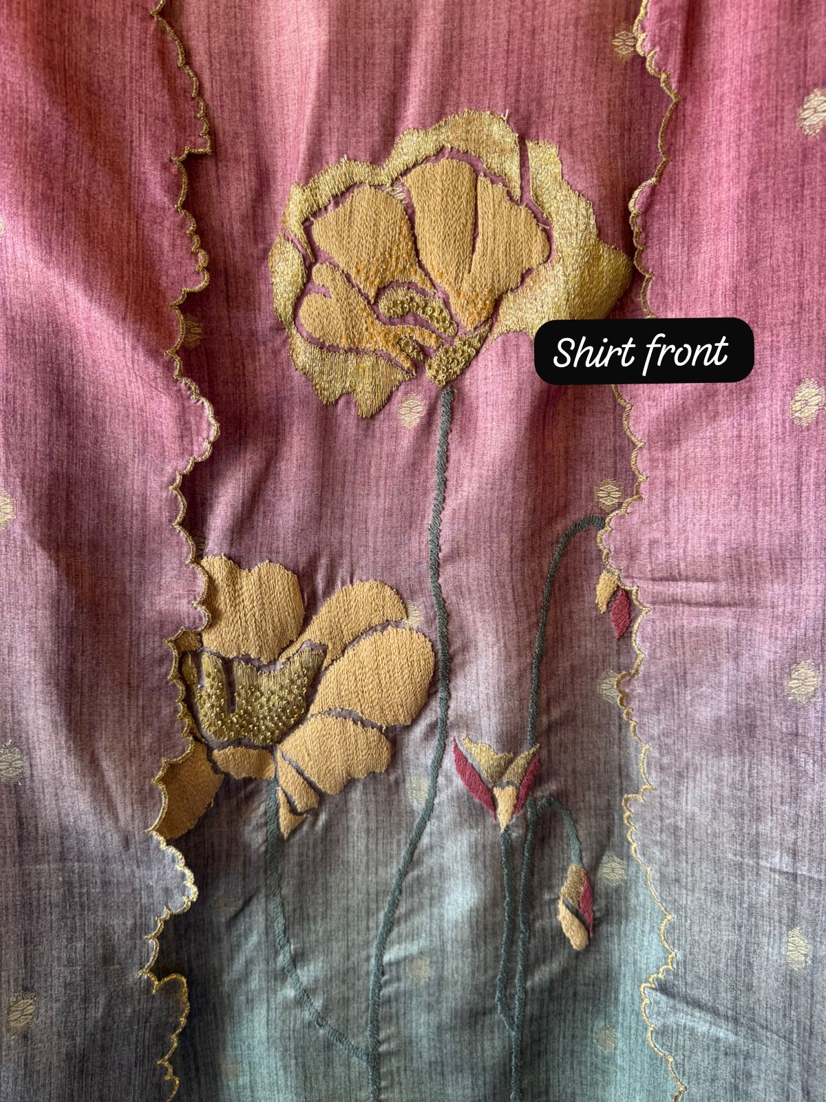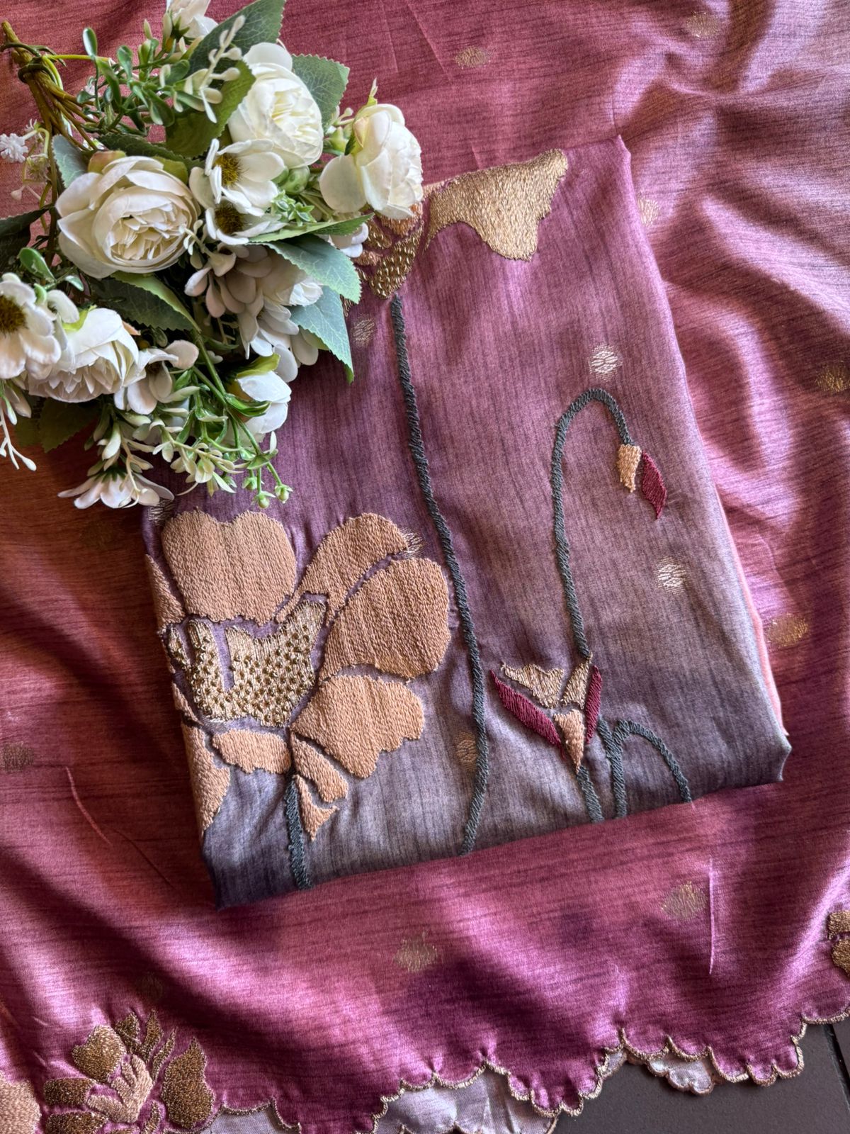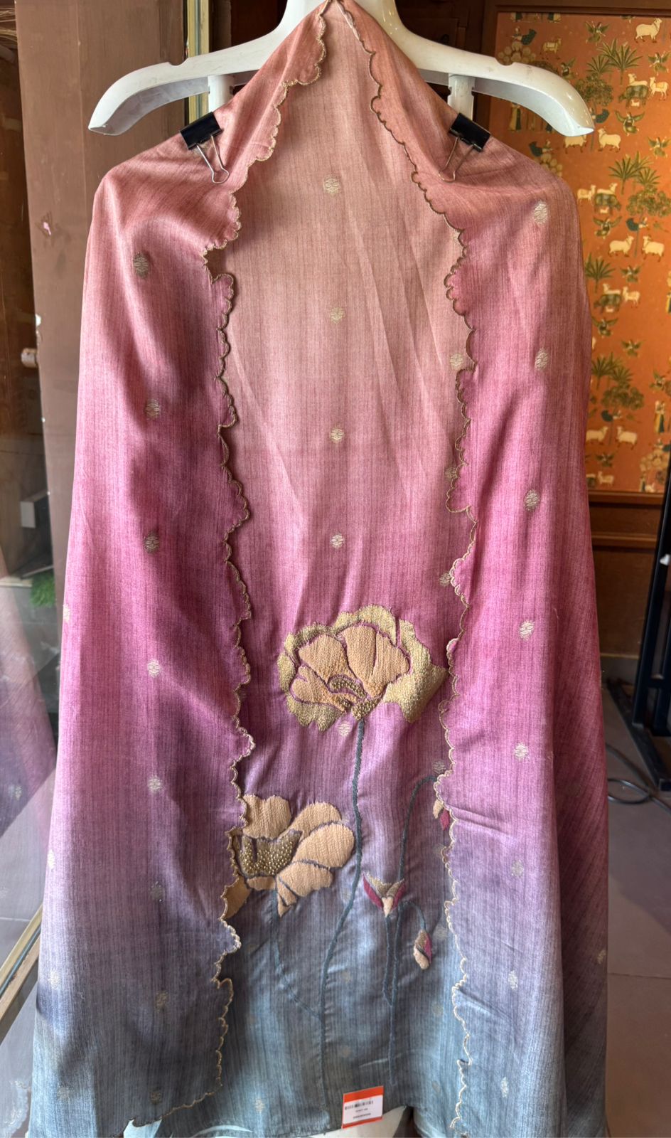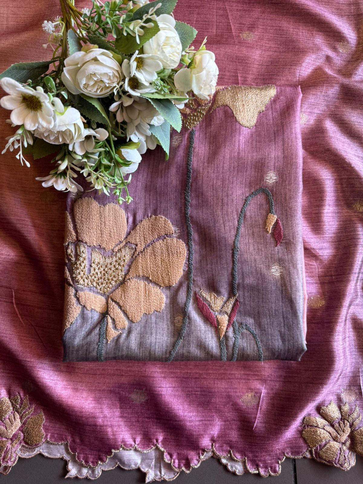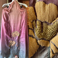 Large floral motifs embroidered in gold thread with dense threadwork and small bead-like added texture and richness.