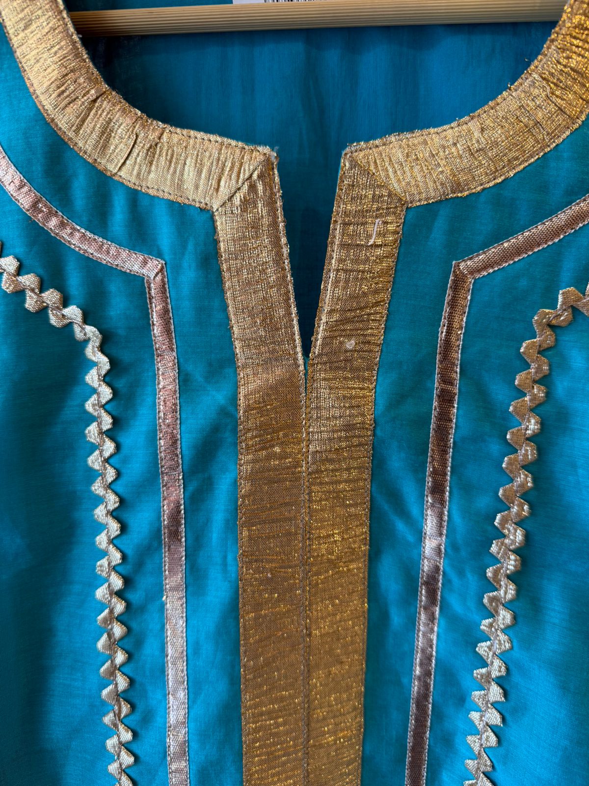 Neckline: Elegant round neckline with front slit, highlighted with rich zari & gota work panel detailing.