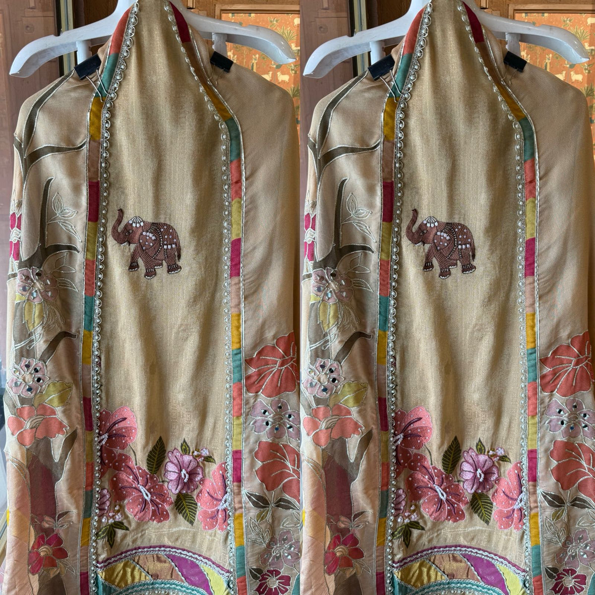 The dupatta is bordered with patchwork-style multicolor design with elephant and Floral concept (in mustard, teal, coral, and rust shades), framed by a delicate pearl lace edging.