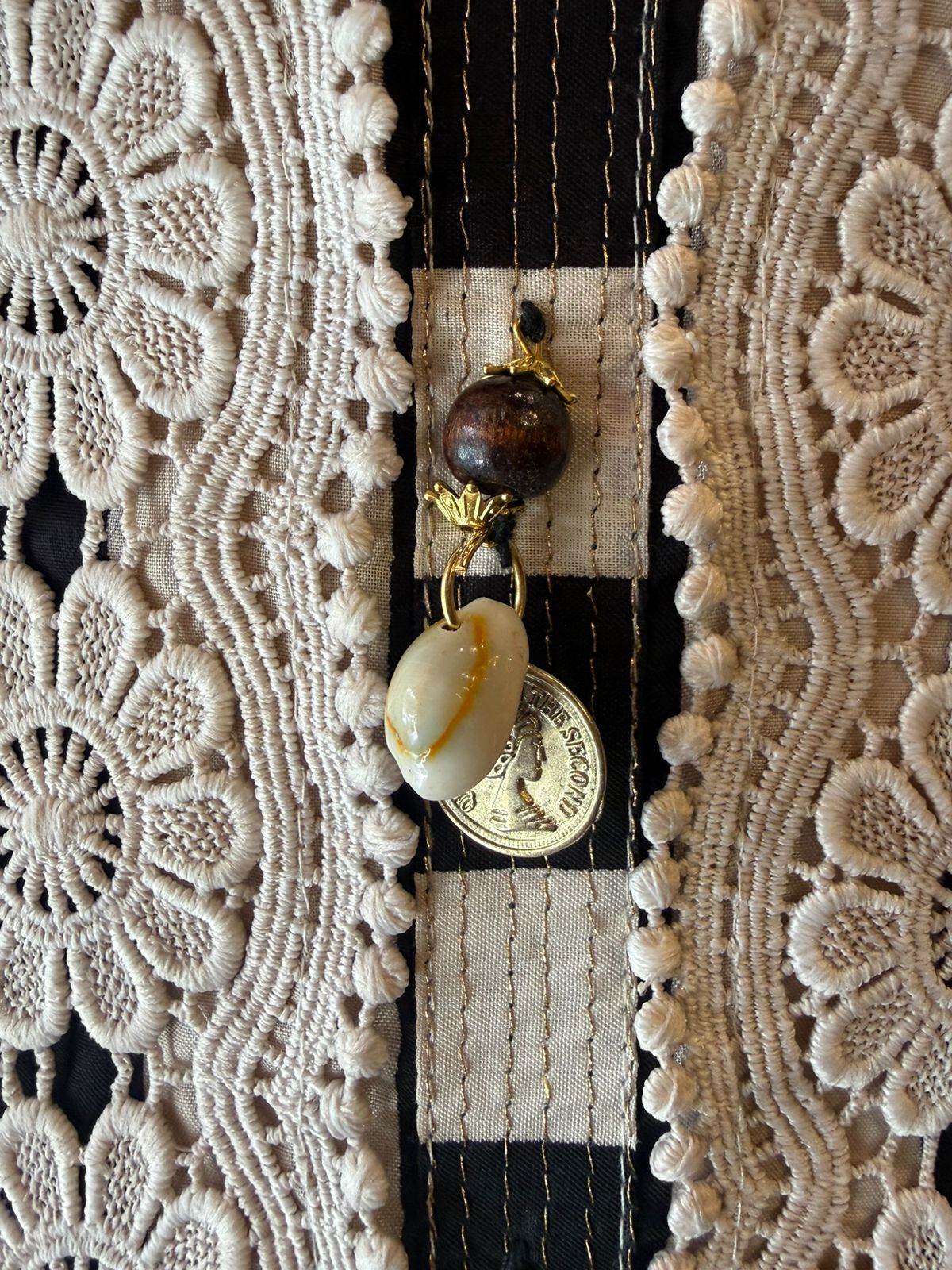Crochet lace panel with thread embroidery and latkans