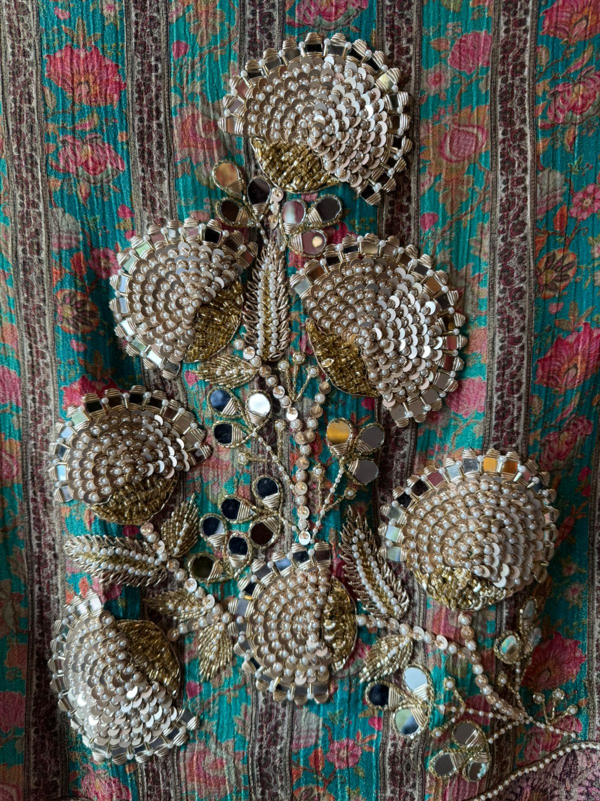 The embroidery is embellished with original mirrors and sequins properly stitched and outlined by gold Nalki’s.