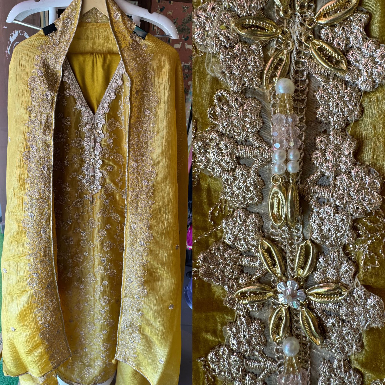 Crushed tissue Unstitched shirt Very smart concept with zari embroidered Jaal on the shirt front with designer neckline