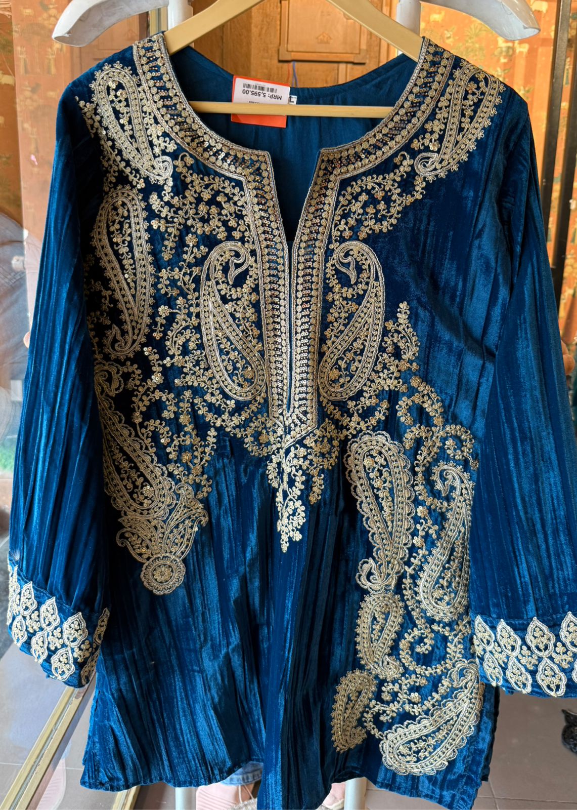Full sleeves in the same crushed velvet fabric.