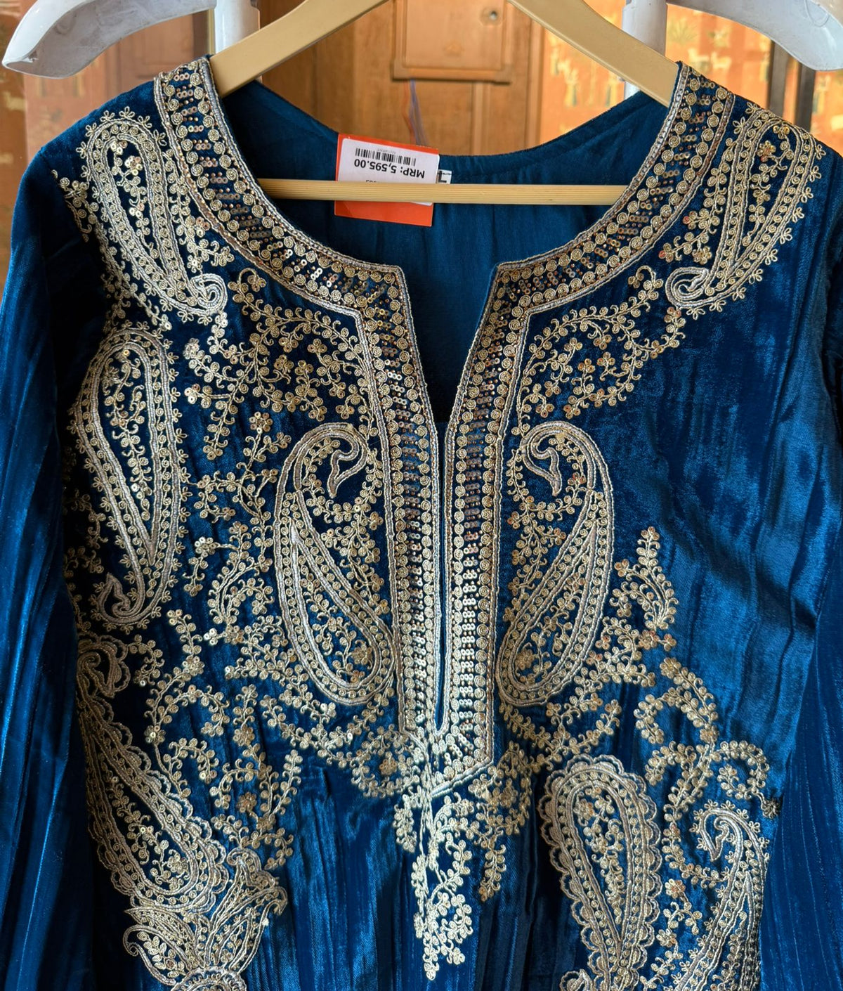 Fully adorned with intricate embroidery forming a border around the neck.