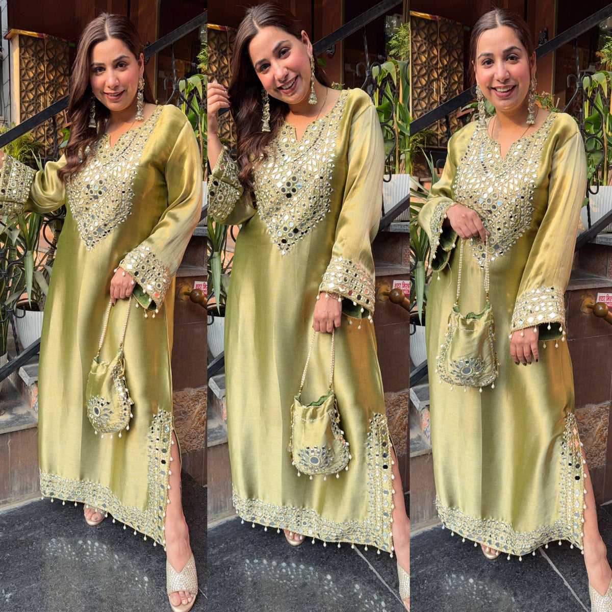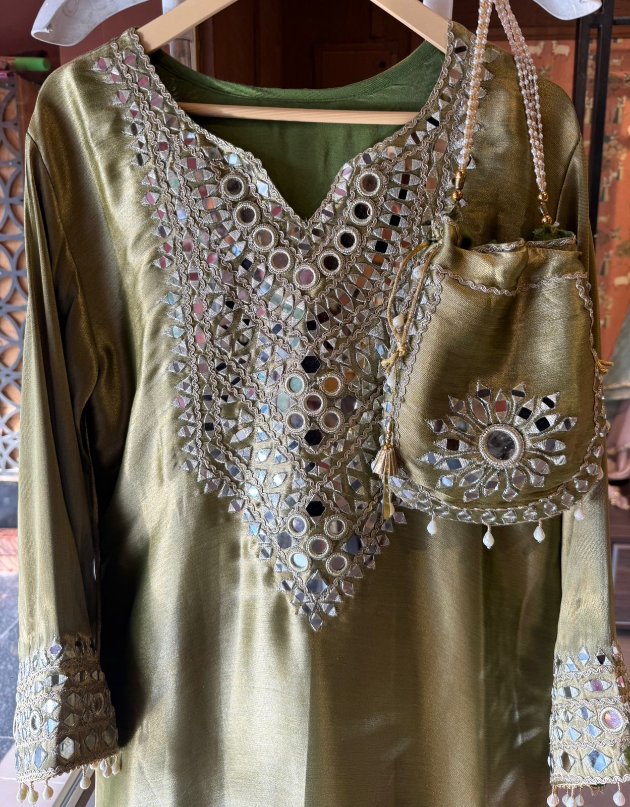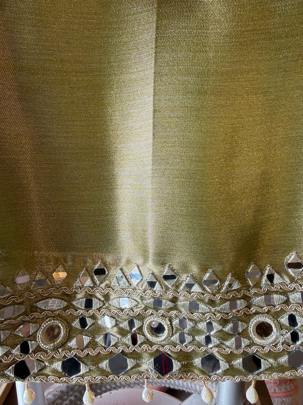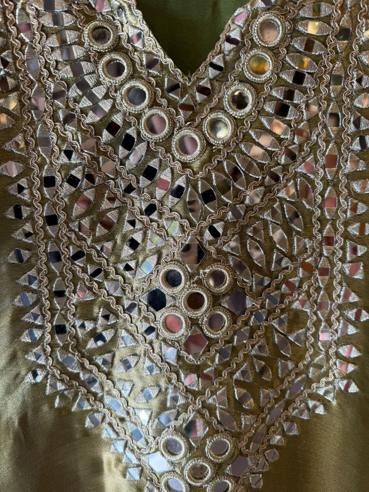 • Heavily adorned with mirror work (shisha) arranged in a geometric floral pattern