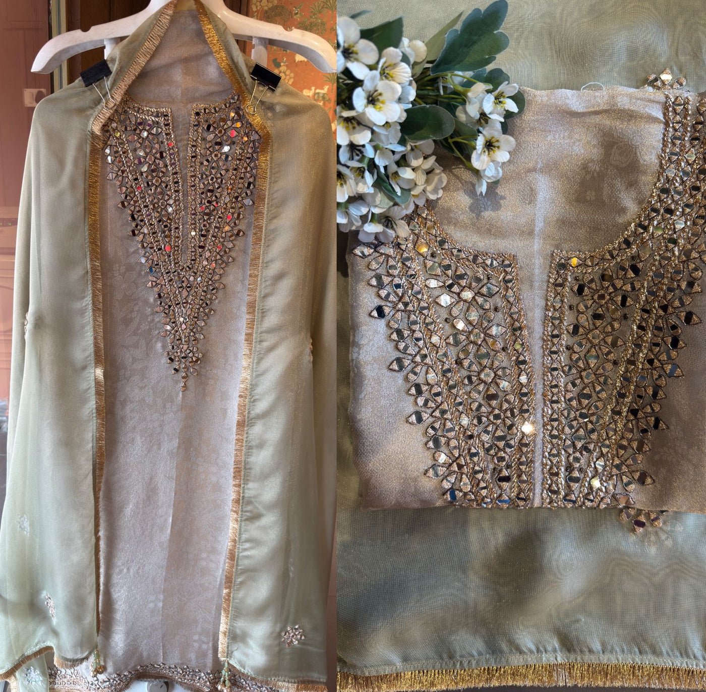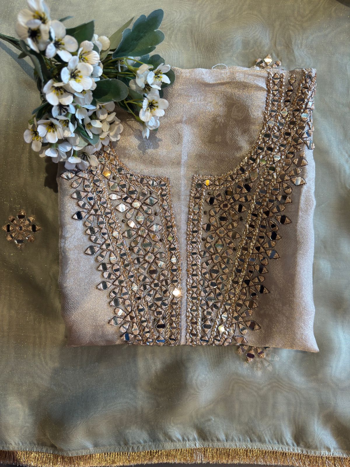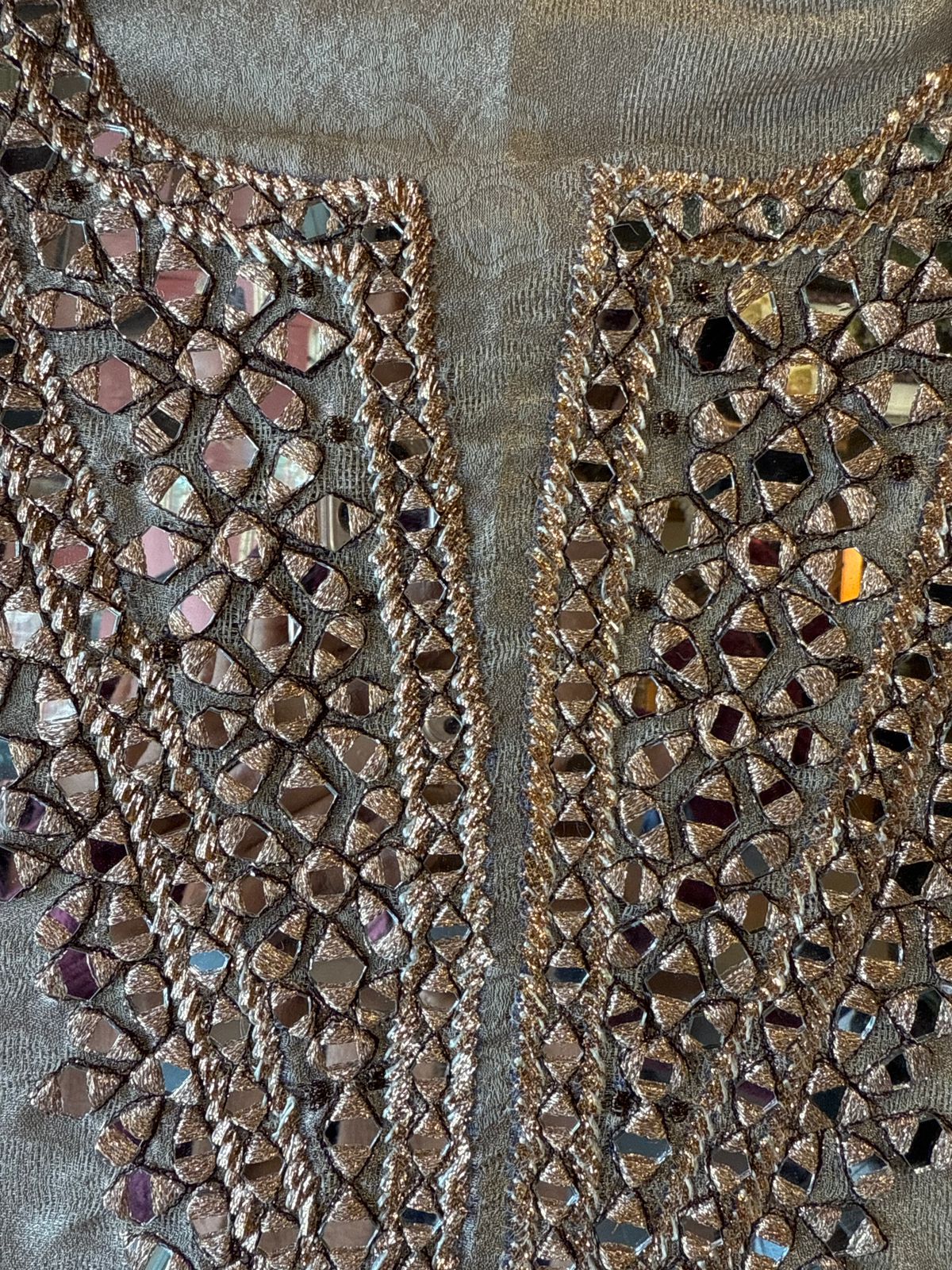 Dense zari embroidery outlining each mirror piece.