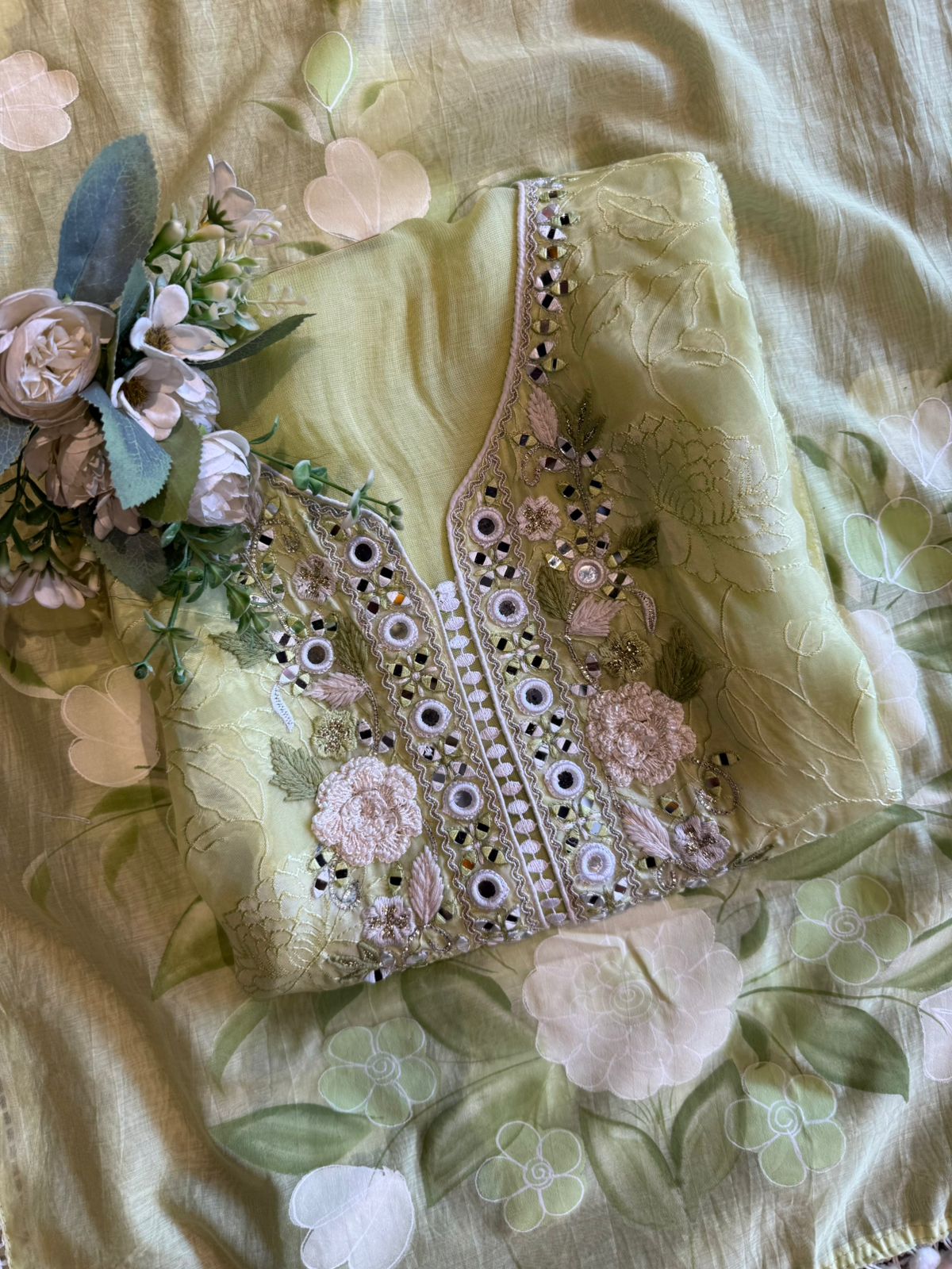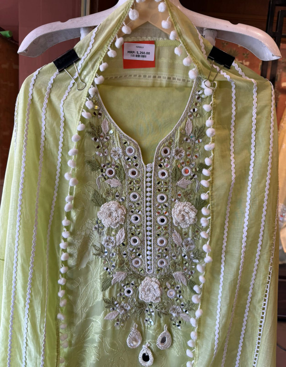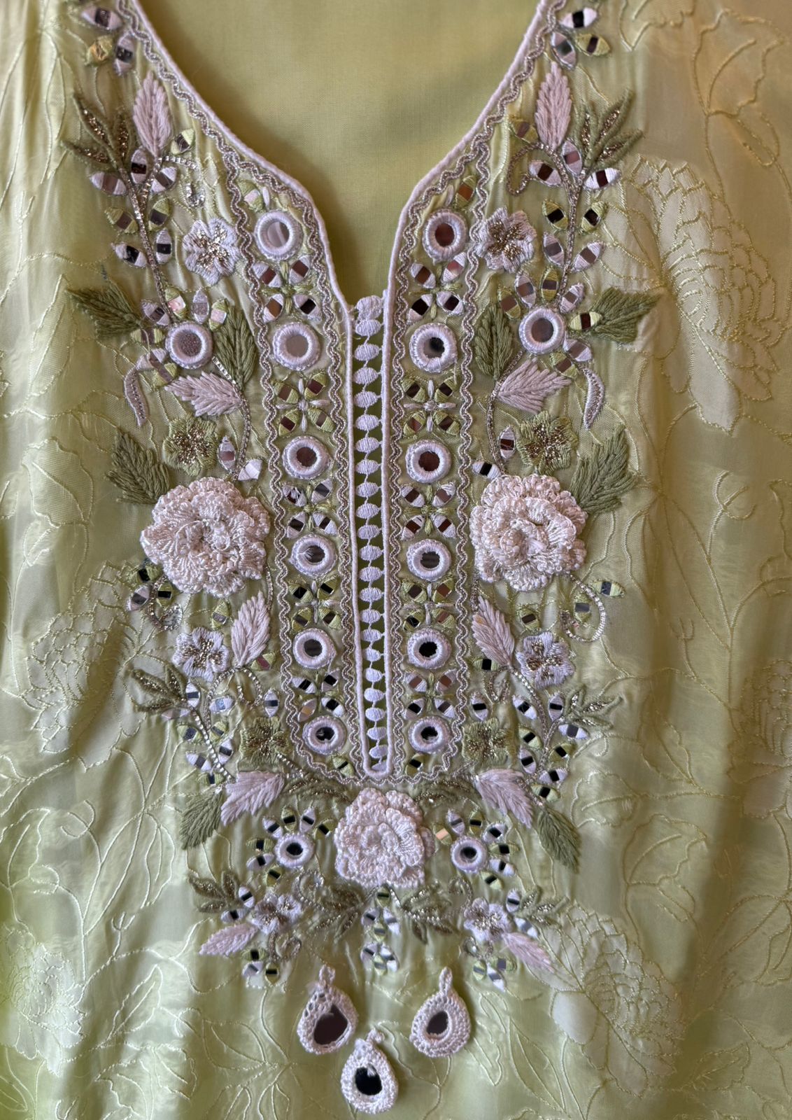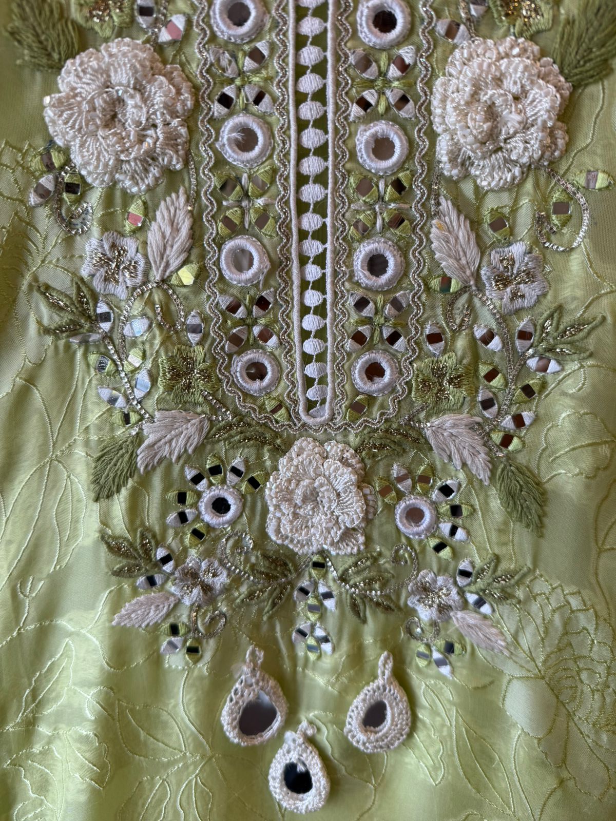 The kurta features intricate thread embroidery combined with fine mirror work and lace accents, creating a rich handcrafted look.