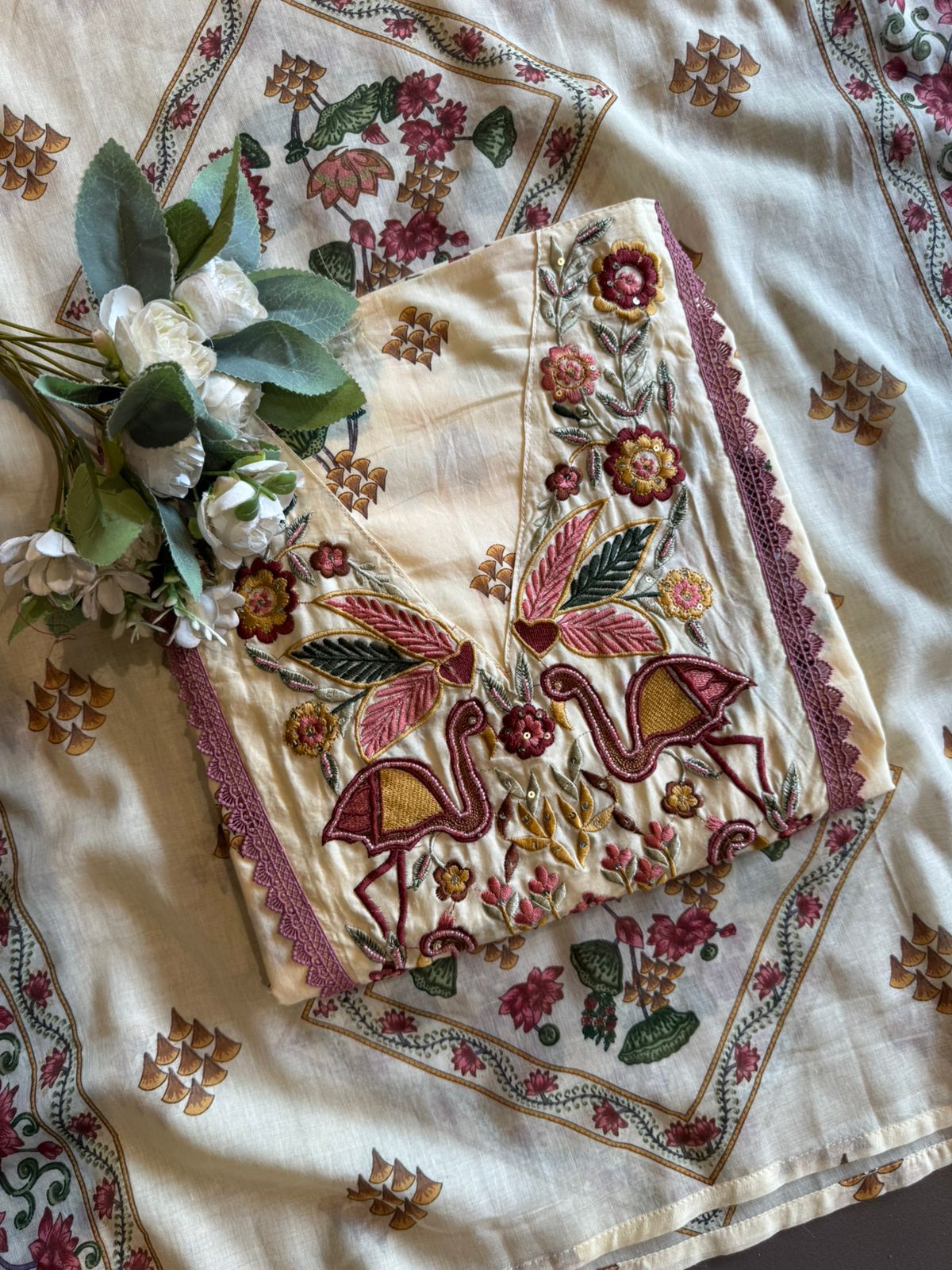 Statement flamingo bird embroidery panel (thread + beadwork)