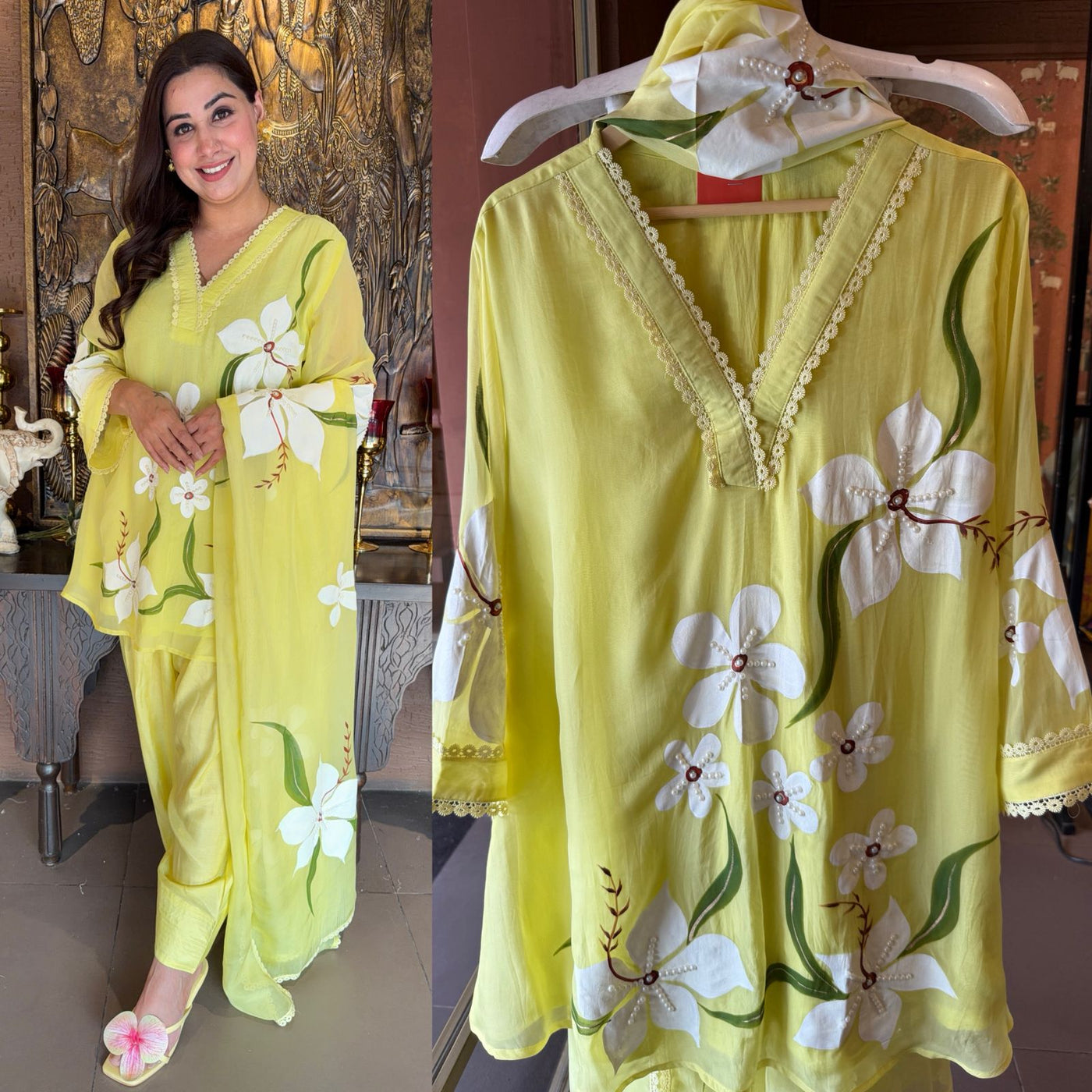 Paired up with a pure organza Matching dupatta with coordinated Handpainted floral placement