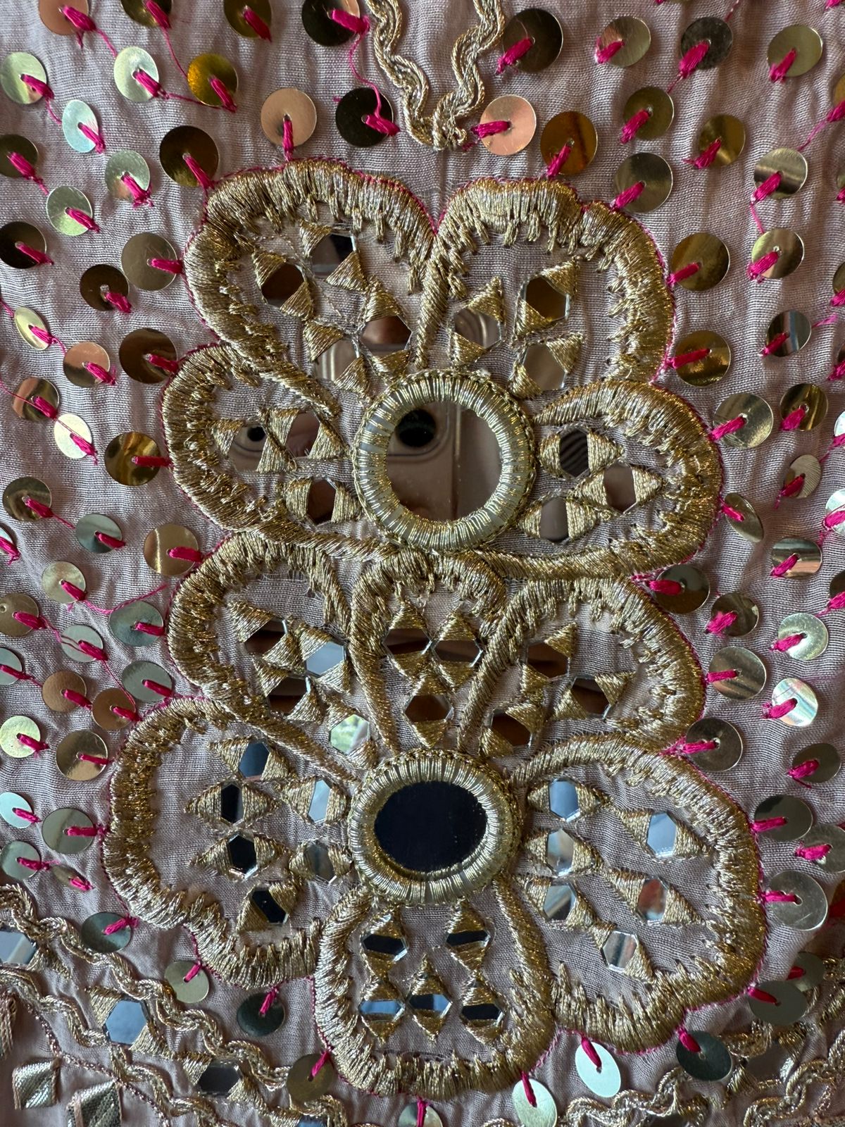 Heavy central motif on the chest made of round mirrors, Sequins, silver stones, and Thread highlights .
