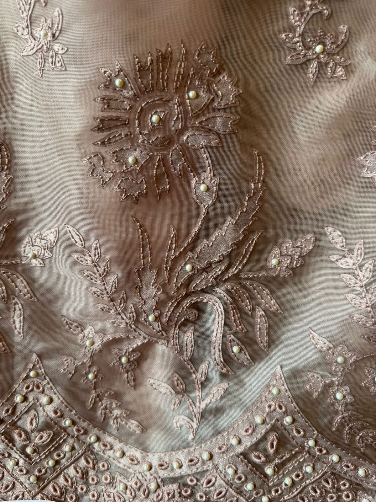 Fine Thread embroidery detailing highlighted with beads.