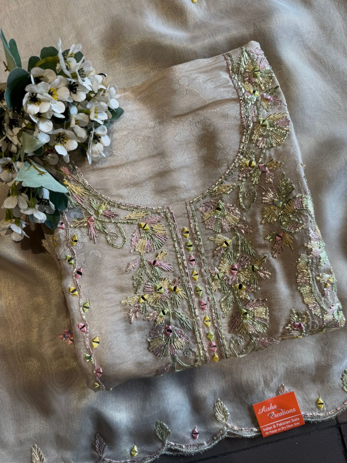 The neckline has a Metallic Zari embroidery with gold & antique tones.