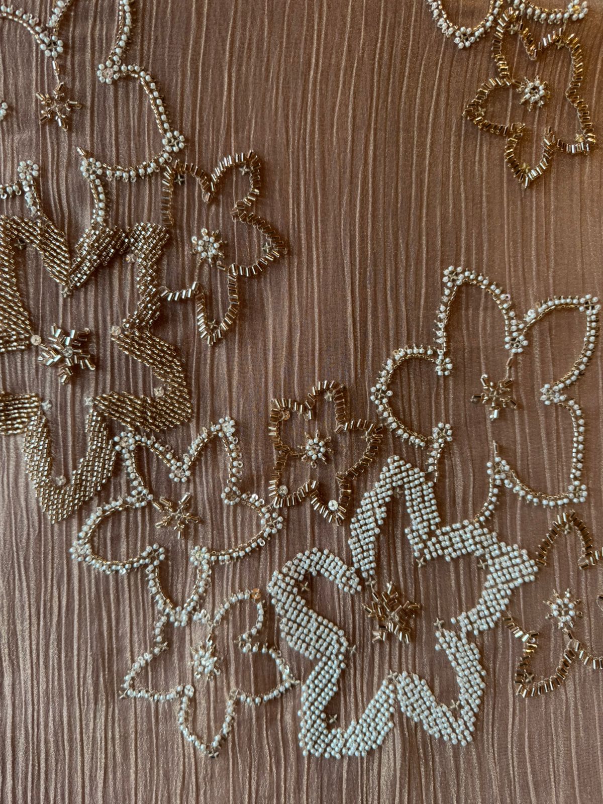 Bead outlines define the floral shapes, giving a refined couture finish.