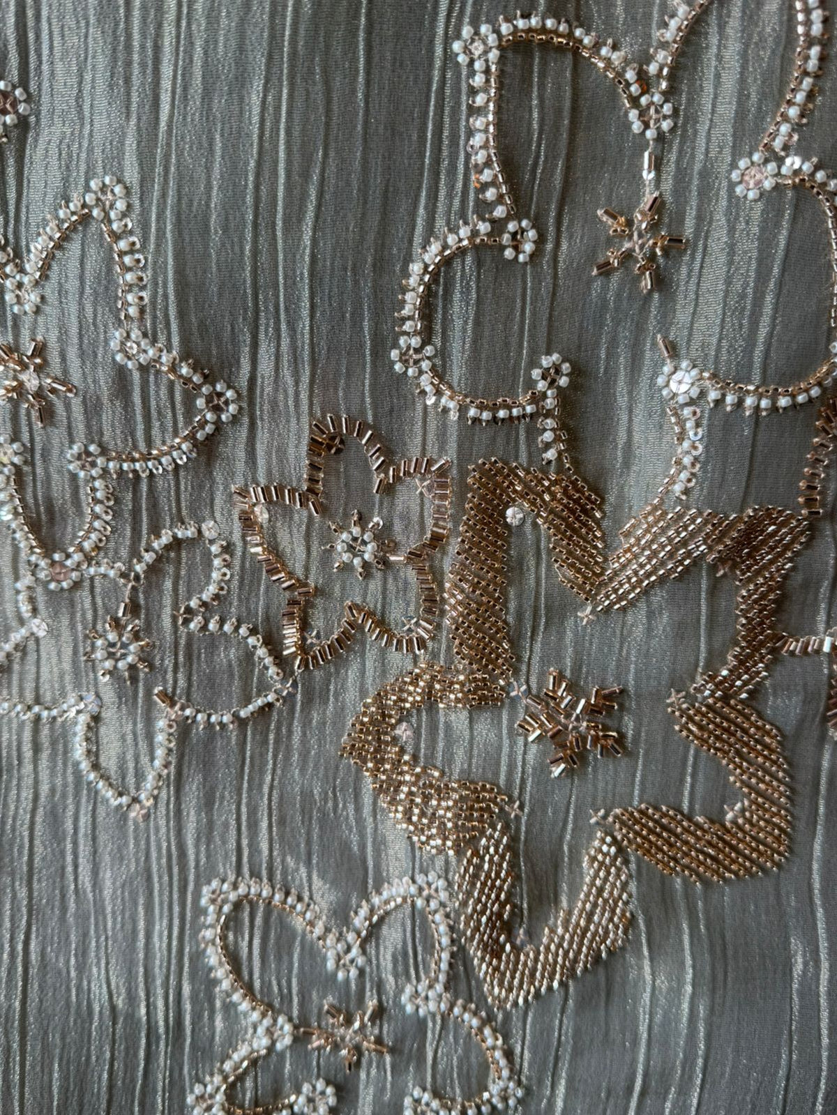 Bead outlines define the floral shapes, giving a refined couture finish.