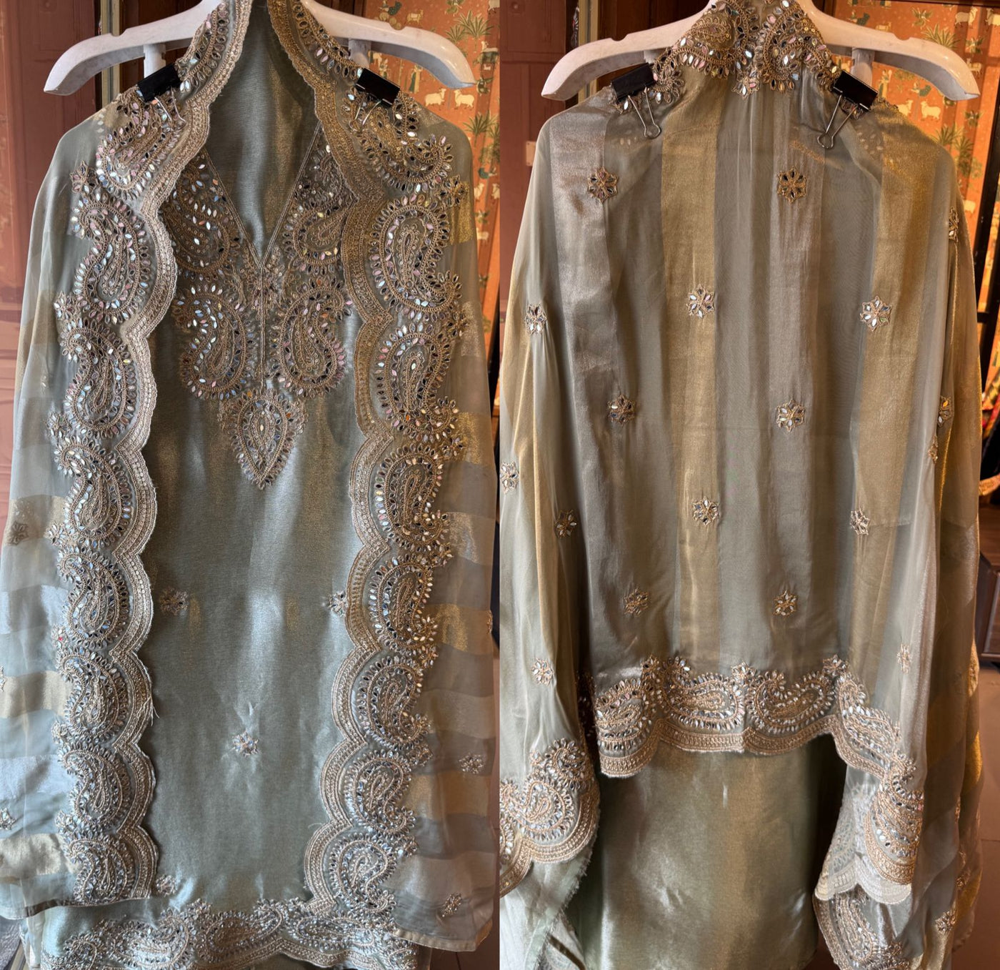 The neckline has beautiful paisley design with original mirror and Dori embellishment creating a shimmering surface effect.